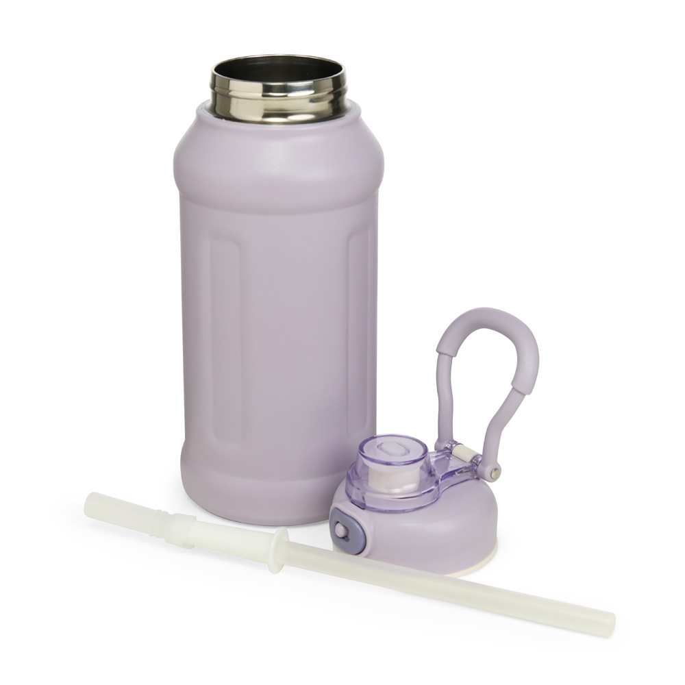 Descrição: Garrafa térmica em inox com capacidade para até 850ml, estrutura de parede dupla e isolamento a vácuo que ajuda a conservar a temperatura de líquidos por mais tempo. Possui tampa rosqueável em plástico com protetor para o bocal e trava de segurança, além de alça fixa reforçada. Acompanha canudo plástico interno.