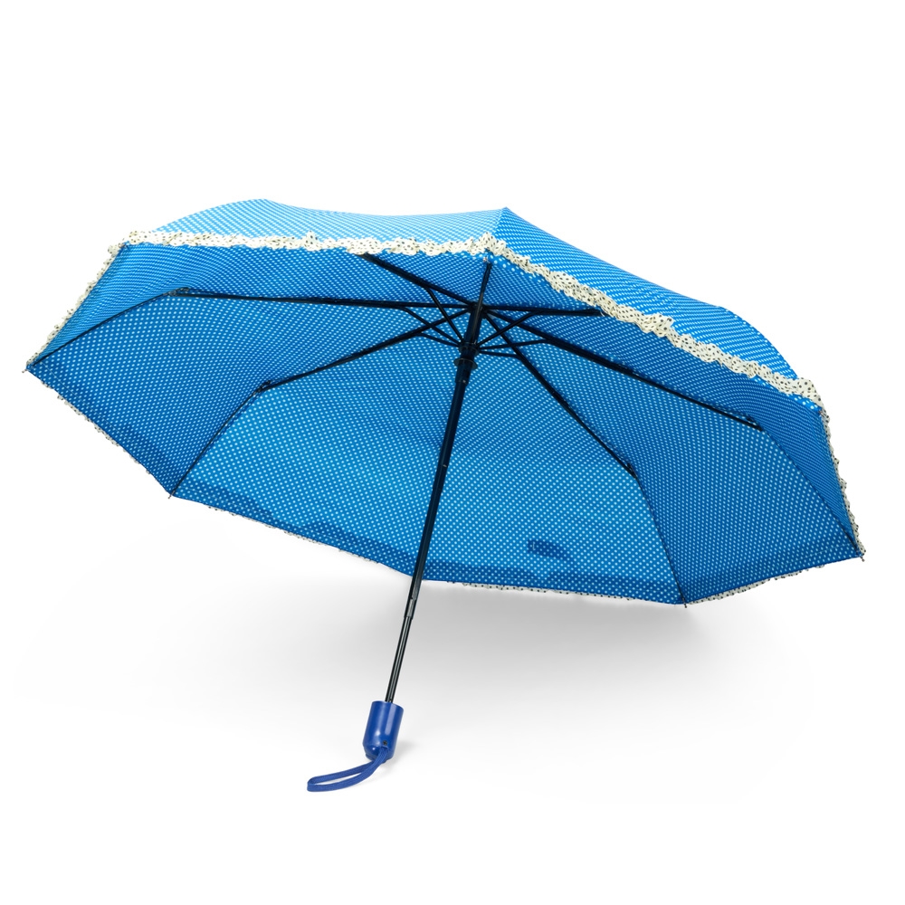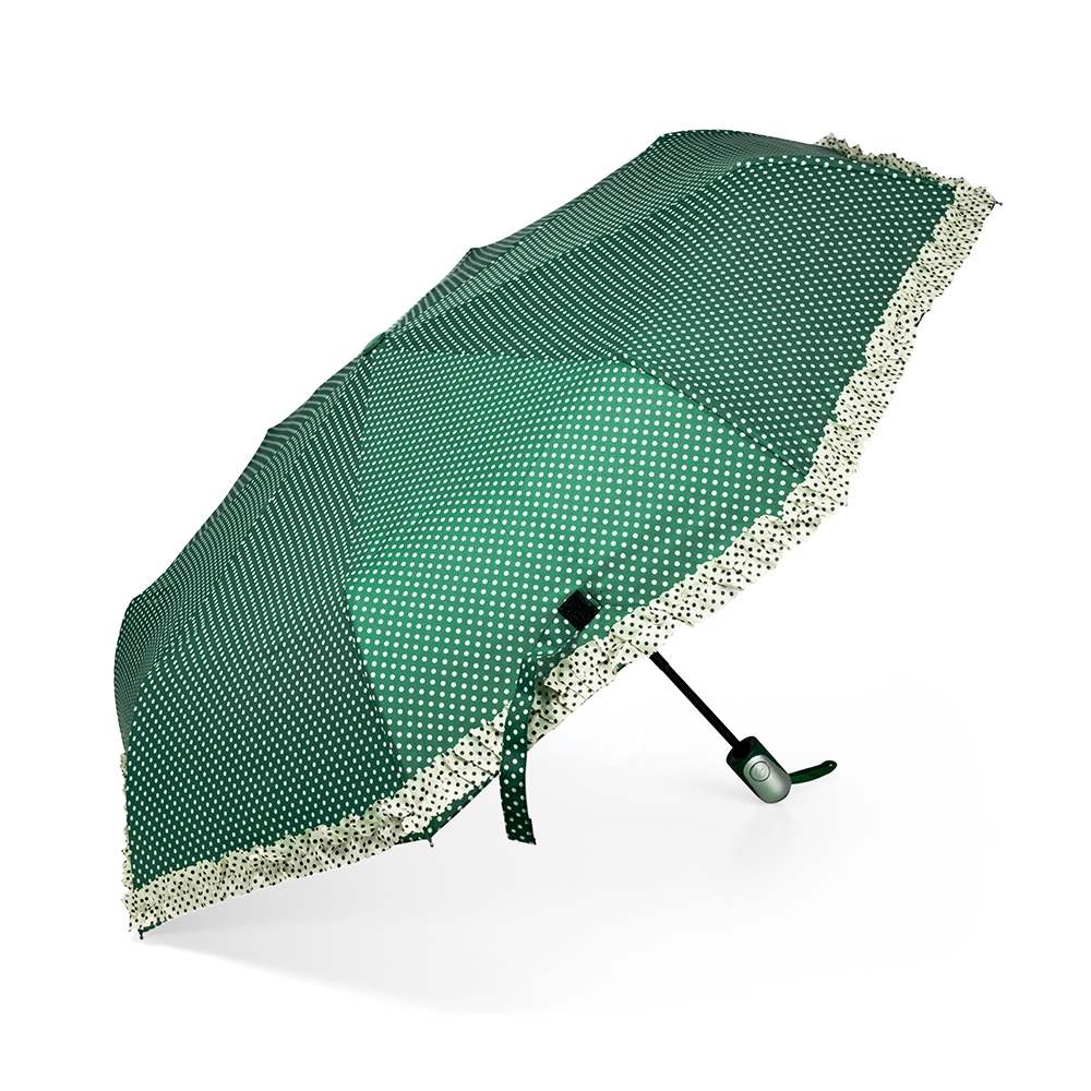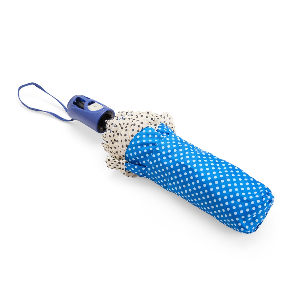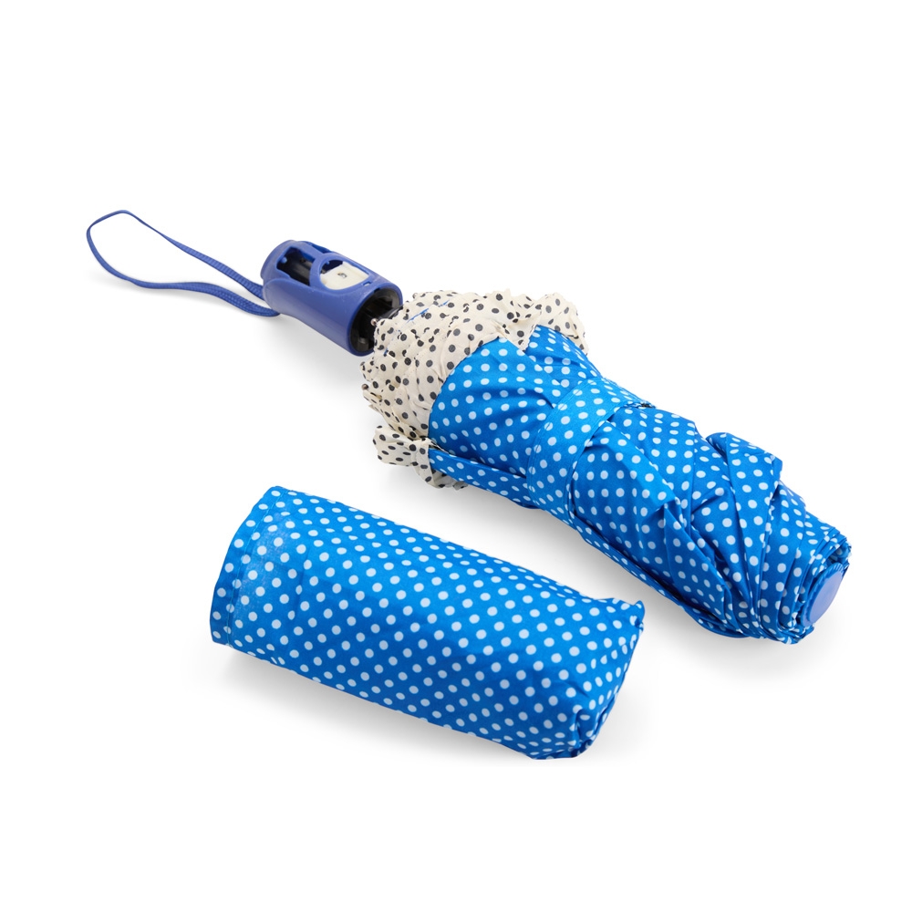 Descrição: Guarda-chuva em poliéster com abertura automática por acionamento de botão. Possui estrutura metálica com oito varetas e pegador em plástico com alça de nylon fixa na ponta. Acompanha capa protetora.