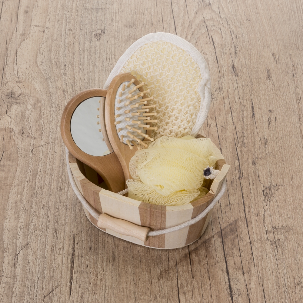 Descrição: Kit banho de madeira com 5 peças. Possui: espelho, escova de cabelo, esponja de banho, bucha de banho e massageador. Acompanha balde com alça e pegador de madeira.