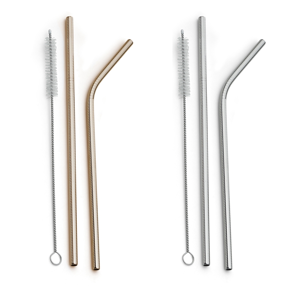Descrição: Kit com 2 canudos de aço e 1 limpador. Contém canudo reto e canudo curvado de 215mm com detalhe superior de dez anéis, limpador com corpo de aço e ponteira plástica.