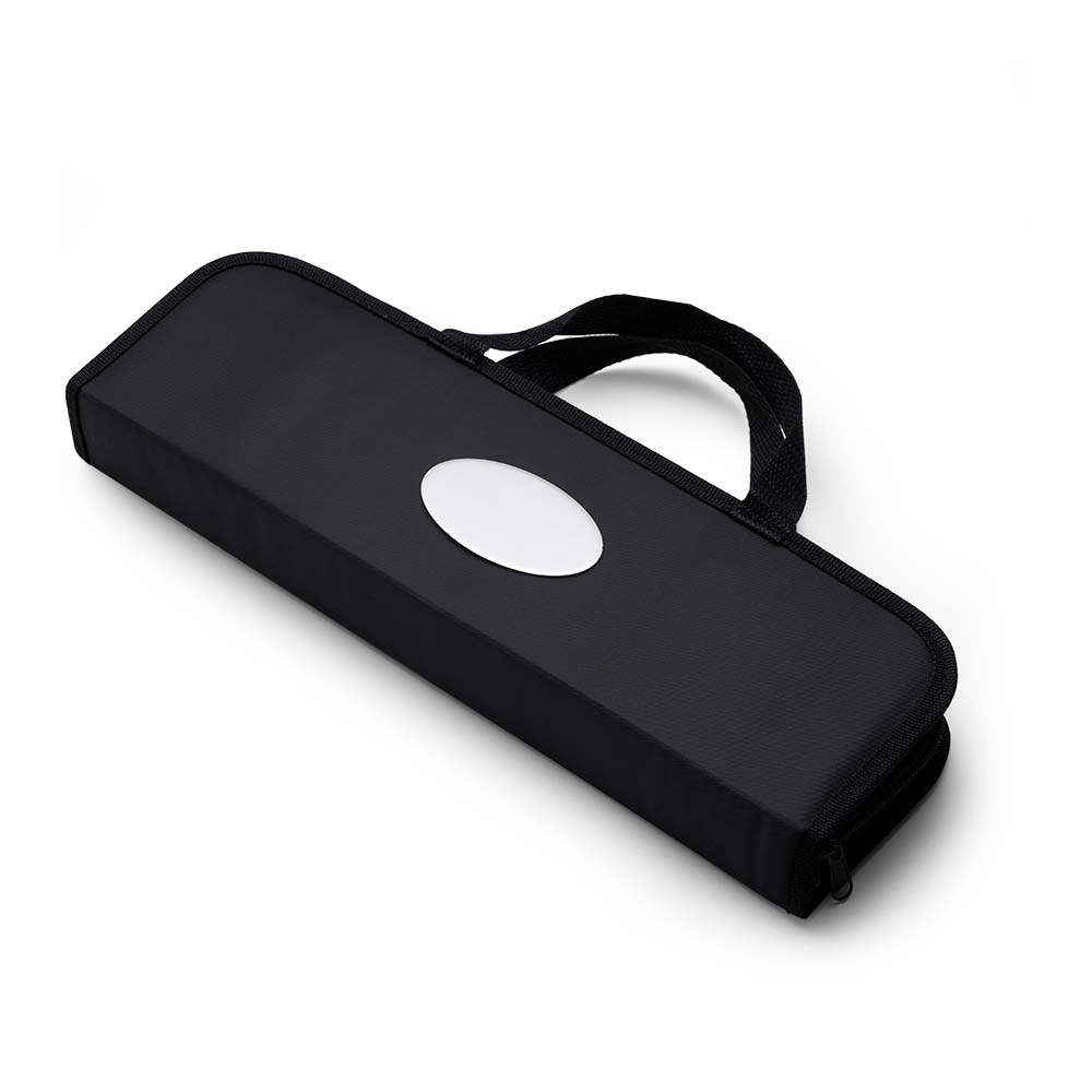 Descrição: Kit Churrasco 17 Peças em estojo de nylon com alça. Contém: pegador, garfo, espátula, faca, pincel, 4 espetos e 8 garfos pequenos para petiscos. Utensílios de inox com proteções plásticas e parte interna com velcro para fixação das peças, acompanha plaquinha metálica para personalização.
