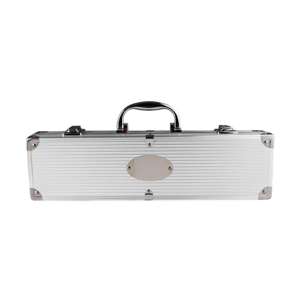 Descrição: Kit de churrasco com três peças em aço inox. O conjunto inclui uma pinça, um garfo e uma faca de seis polegadas. Acompanha maleta de alumínio com placa para personalização.