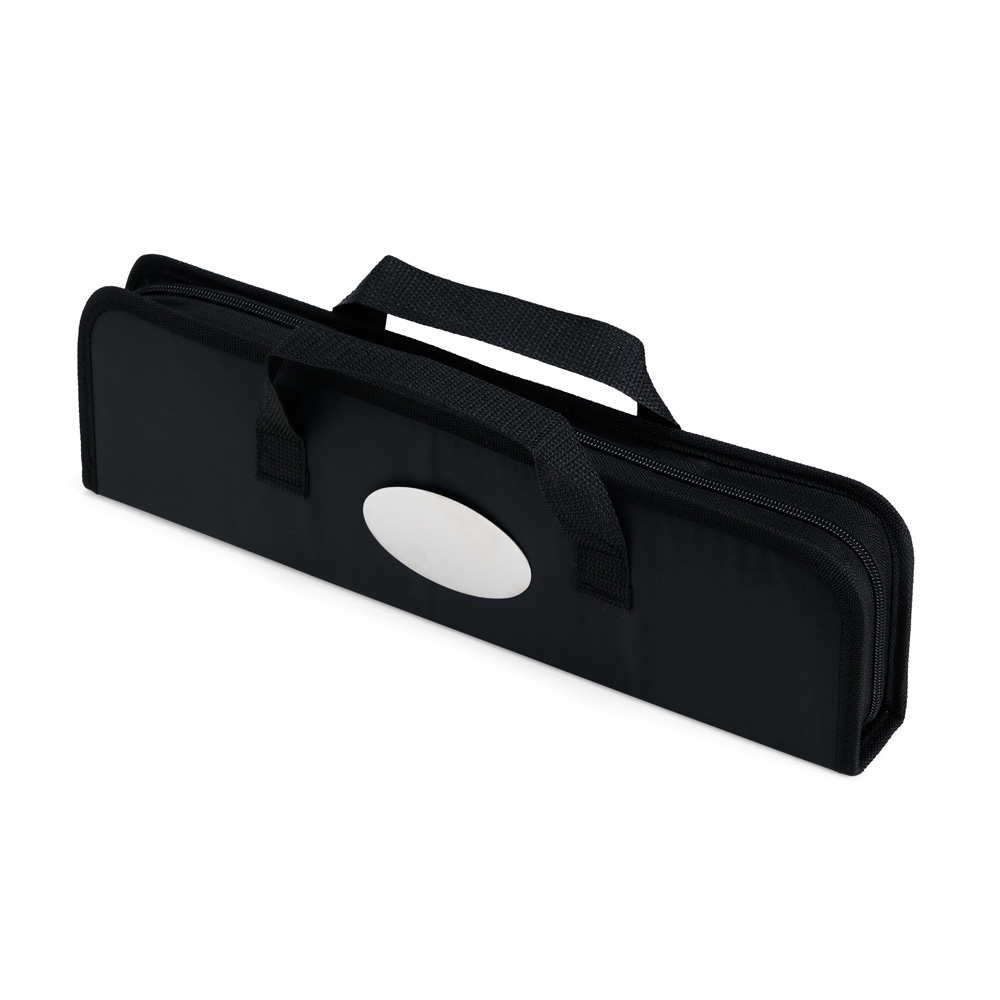 Descrição: Um kit ideal para acompanhar momentos de confraternização marcantes que apenas um bom churrasco pode proporcionar. O nosso kit traz 5 itens em aço inox indispensáveis para preparar um bom churrasco: 1 faca de 6,2 polegadas de lâmina, um garfo, 1 espátula, 1 pincel com cerdas de silicone e 1 pegador. Além disso, ele acompanha um estojo de nylon com um par de alças fixas para dar maior facilidade de transporte, além de uma placa metálica personalizável com verso autoadesivo.
