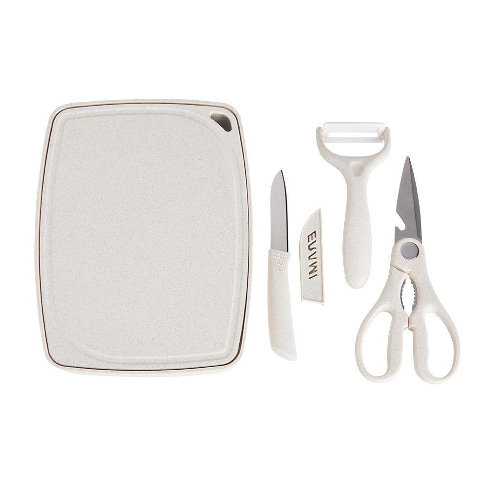 Descrição: Kit Cozinha 3 Peças em plástico de palha de trigo e inox. Contém tesoura culinária, faca com protetor e descascador de legumes. Acompanha bandeja e tampa, podendo ser utilizada como recipiente e tábua para corte.
