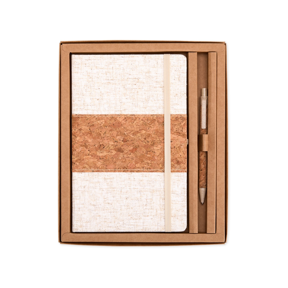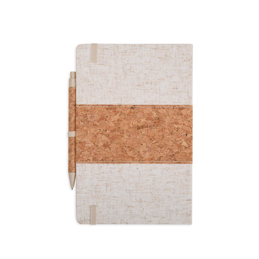 Descrição: Este kit contém uma Caderneta A5 em linho com detalhe em cortiça e suporte para caneta, marcador de página em cetim, aproximadamente 82 folhas com pauta e caneta de cortiça com detalhes em palha de trigo, carga esferográfica azul 1.0mm e acionamento por clique.