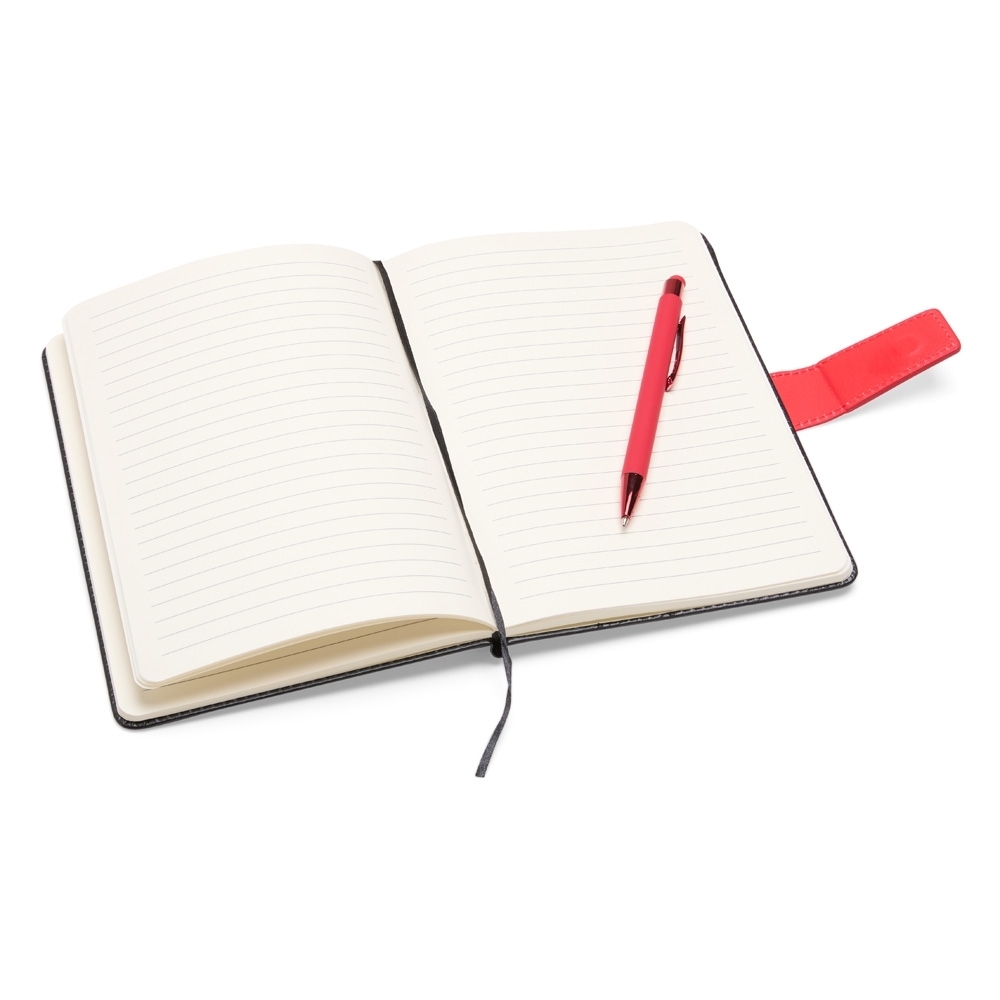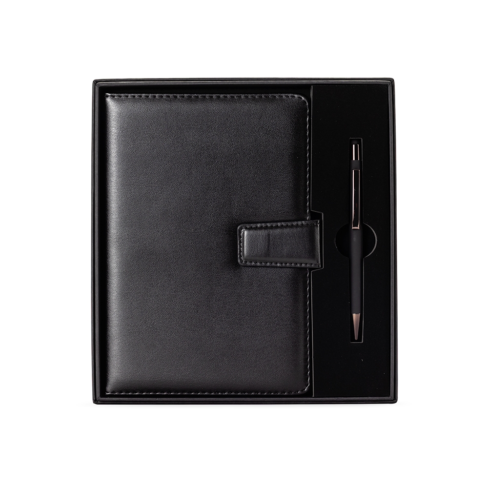 Descrição: Kit executivo com duas peças, composto por uma caderneta de capa em couro sintético com fechamento magnético e cerca de 80 folhas pautadas, e uma caneta em metal com detalhes em plástico, ponteira emborrachada para uso em dispositivos touchscreen e carga esferográfica azul de 1,0 mm. Acompanha uma caixa de papelão com berço em espuma para a caneta.