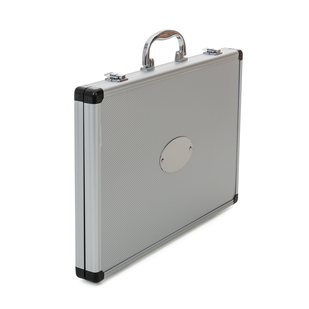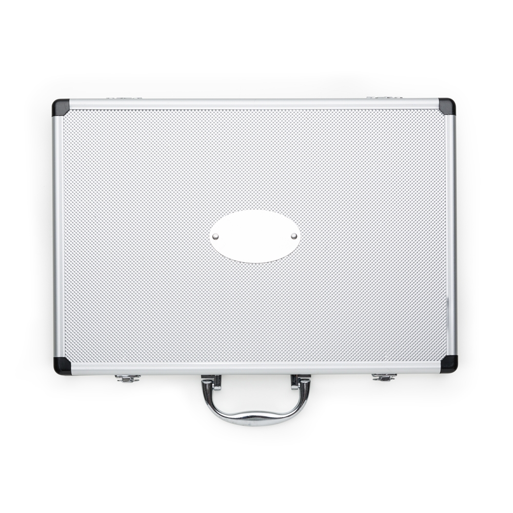 Descrição: Kit Facas 5 peças em maleta de alumínio texturizado com placa central para personalização. Possui cinco facas(com proteção plástica) inteiras inox em tamanhos diferentes, parte interna da maleta revestida com veludo e possui também elásticos para fixar as peças. Parte externa da maleta possui uma alça e bordas plásticas pretas, duas dobradiças inferiores e parte superior com duas travas.