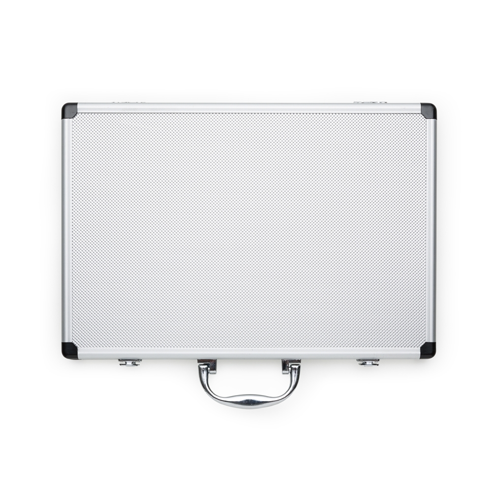 Descrição: Kit Facas 5 peças em maleta de alumínio texturizado com placa central para personalização. Possui cinco facas(com proteção plástica) inteiras inox em tamanhos diferentes, parte interna da maleta revestida com veludo e possui também elásticos para fixar as peças. Parte externa da maleta possui uma alça e bordas plásticas pretas, duas dobradiças inferiores e parte superior com duas travas.