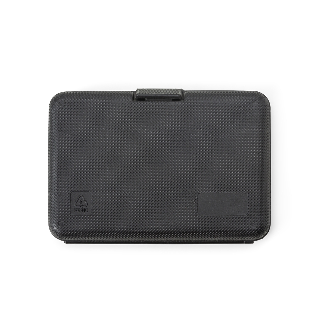 Descrição: Kit ferramenta 11 peças em estojo plástico. Maleta plástica com detalhe retangular no centro frontal e verso com o detalhe na lateral inferior, possui texturização no estojo e uma trava superior. Acompanha: conjunto de 5 chaves Allen, trena de 1 metro, chave teste, estilete, chave Philips, chave de fenda e alicate.