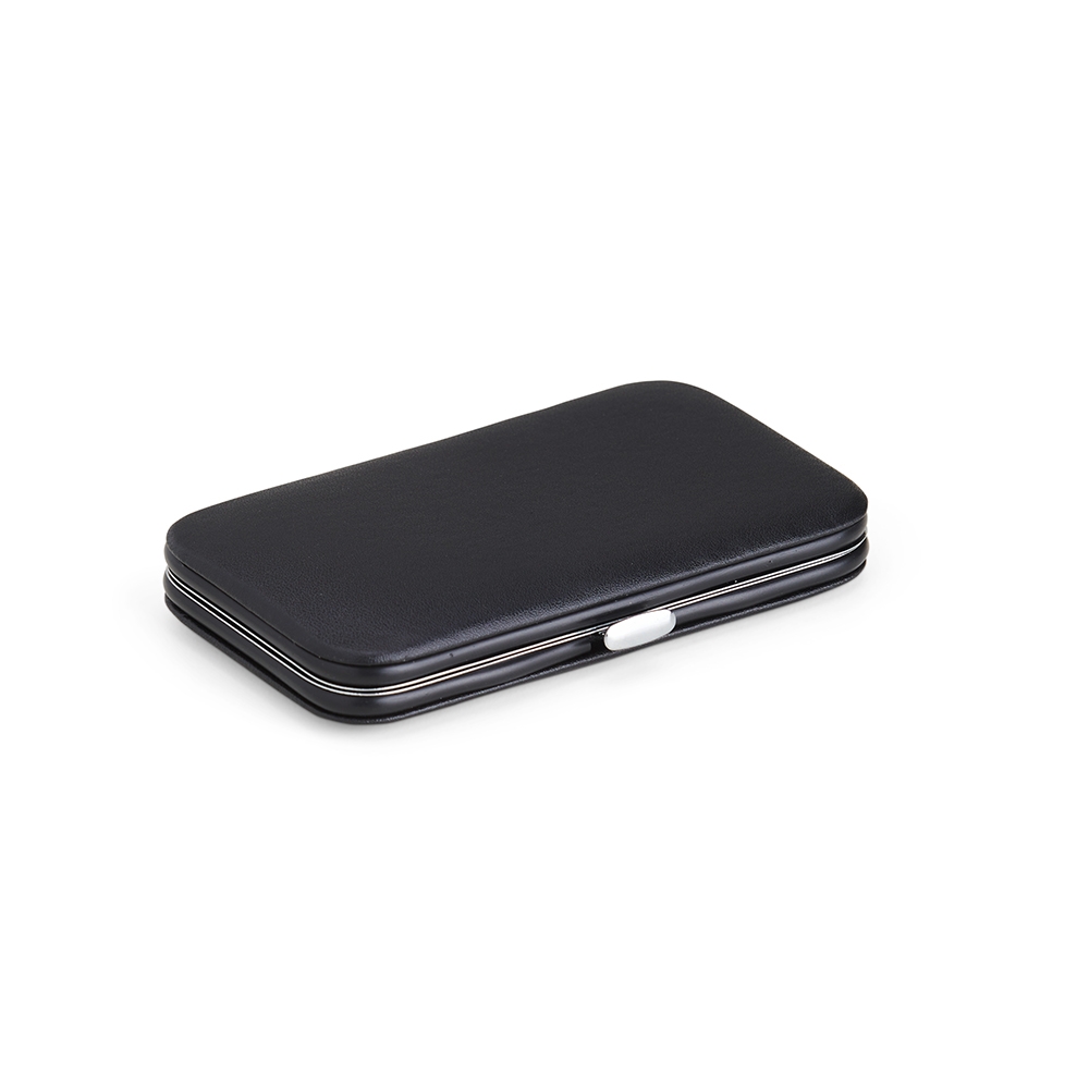 Descrição: Kit manicure 7 peças em estojo de couro sintético. Possui: dois cortadores de unhas, tesoura, lixa, pinça, empurrador de cutícula e espátula para ouvido. Parte interna de TNT com suporte de couro sintético para fixar as peças. Para abrir o estojo basta apertar o botão central.