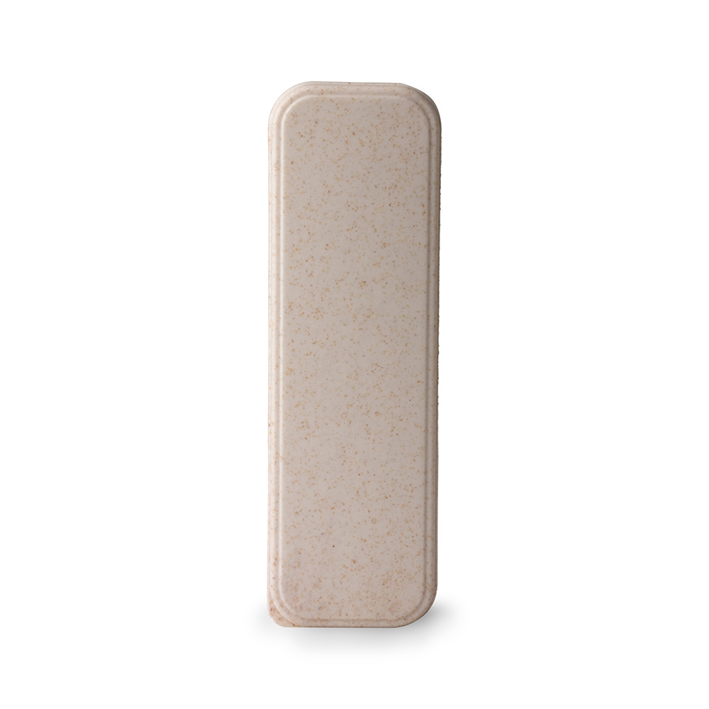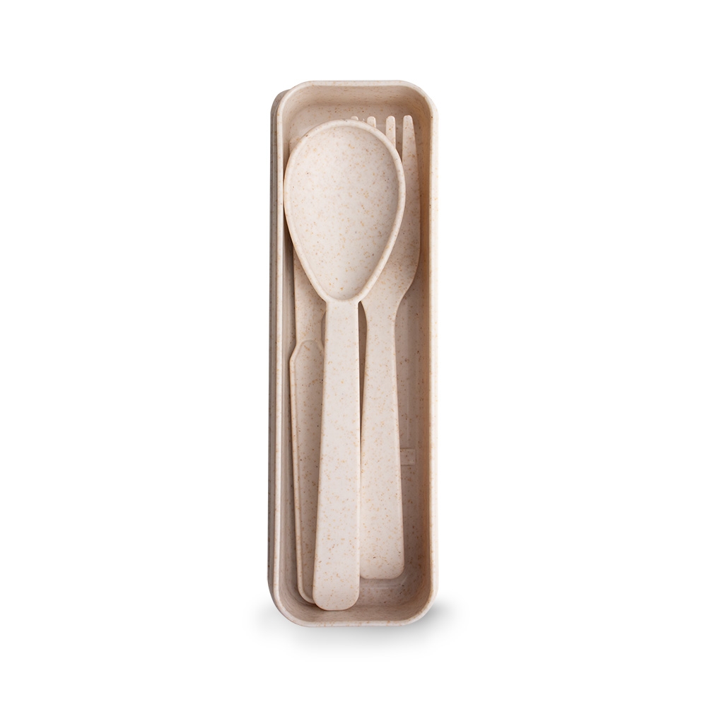 Descrição: Kit de talheres em fibra de trigo. Contém três peças: garfo, faca e colher, acompanhadas de estojo com tampa de encaixe.