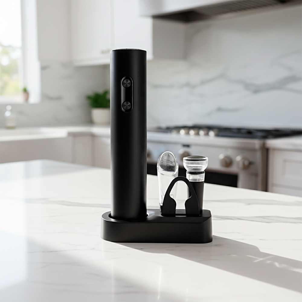 Descrição: Kit vinho com cinco peças, incluindo: saca-rolhas em plástico e aço carbono com acionamento por botões alimentado por quatro pilhas AA (não inclusas), bico dosador e rolha em plástico e borracha TPR, cortador de lacre e base em plástico.