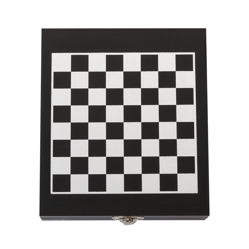 Descrição: Kit vinho 4 peças em estojo tabuleiro de xadrez. Contém wine collar, tampa de bico, bico condutor com tampa e saca-rolhas metálico com lâmina de corte e abridor de garrafa. Estojo com trava de segurança e área interna com berço de espuma, acompanham 32 peças de xadrez e plaquinha metálica para personalização.