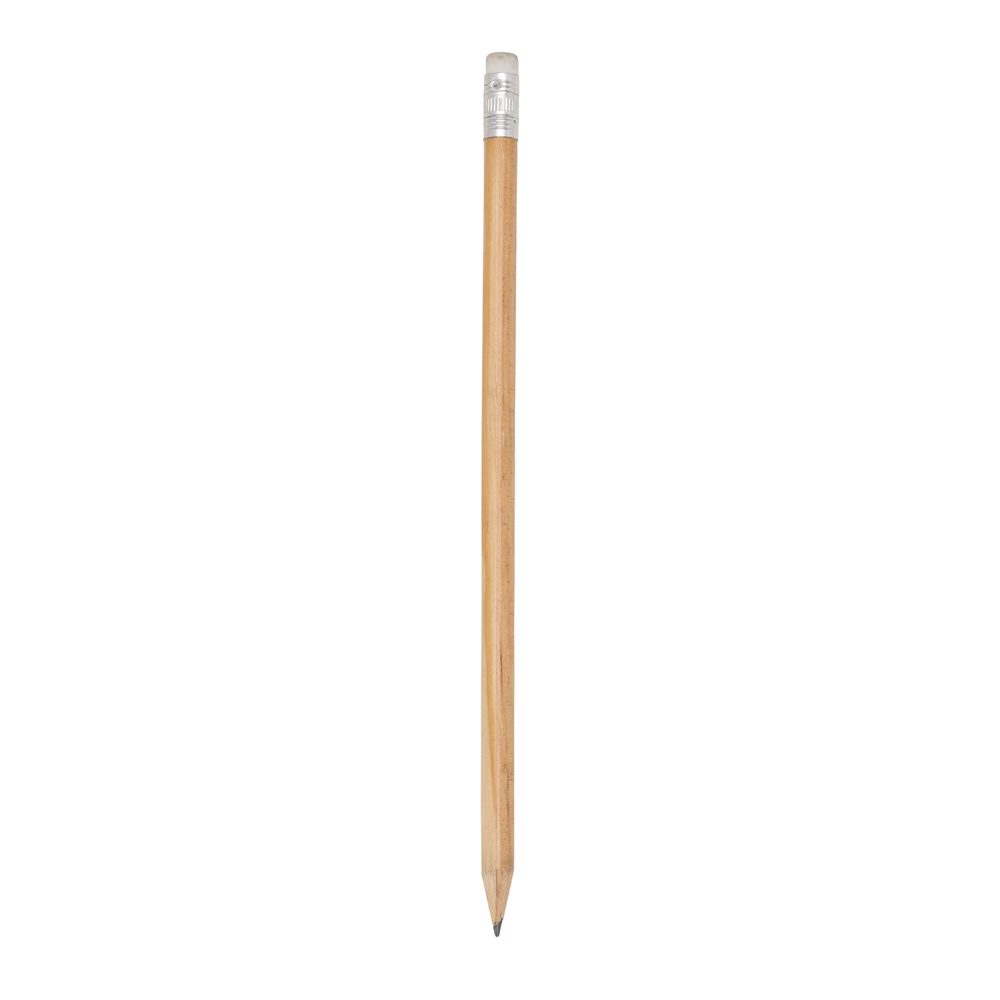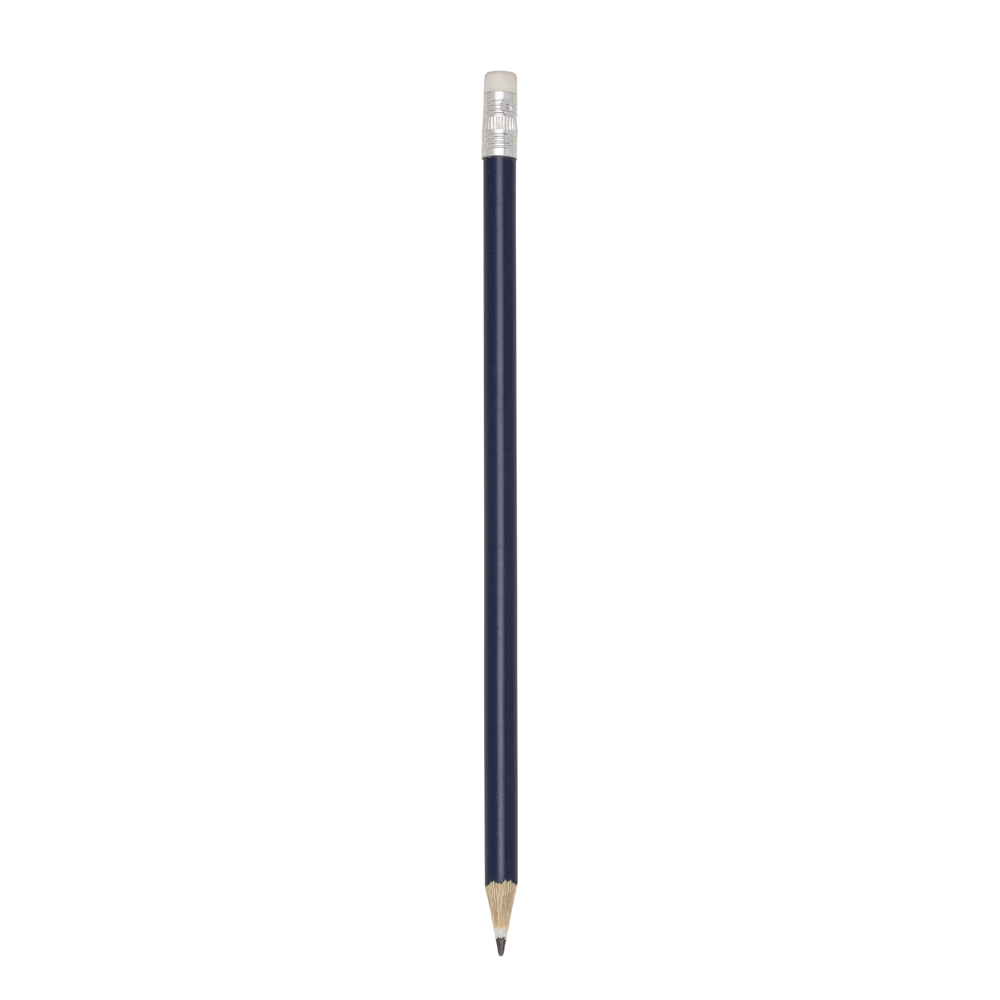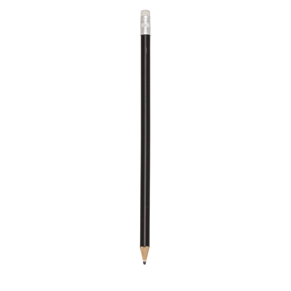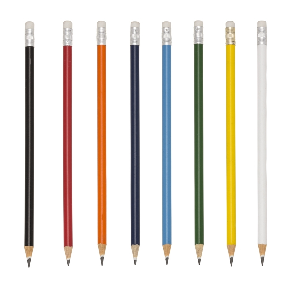 Descrição: Lápis resinado colorido com borracha e grafite preto, guarnição prateada.