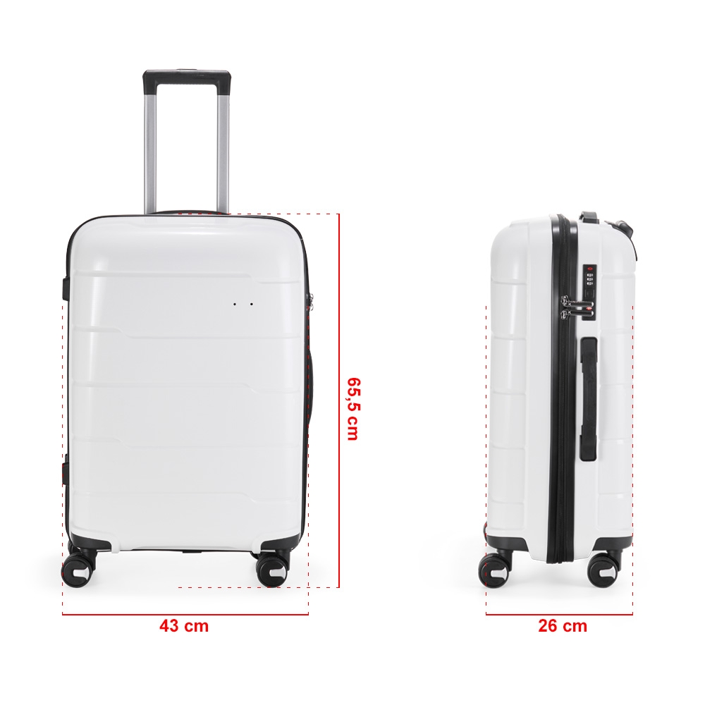Descrição: Mala de viagem 66 litros em plástico PP (casca dura), contém cadeado numérico TSA. Compartimentos com bolso telado e cinta compressora para roupas. A mala possui duas alças de mão, puxador retrátil com regulagem de tamanho, quatro rodinhas 360º e apoios laterais. Acompanha placa para personalização.