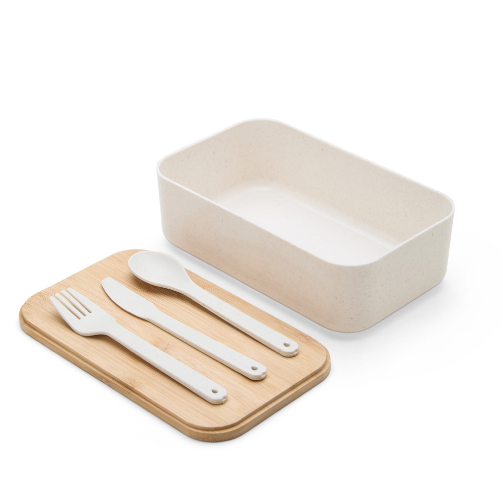 Descrição: Marmita em fibra de trigo com tampa de bambu de 1 litro. Possui elástico para um transporte seguro. Acompanha garfo, faca e colher. Obs: O tempo de aquecimento no micro-ondas não deve ultrapassar 3 minutos.