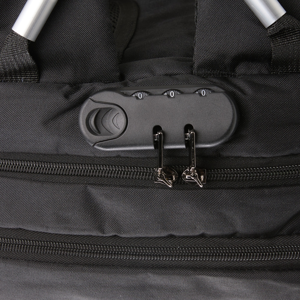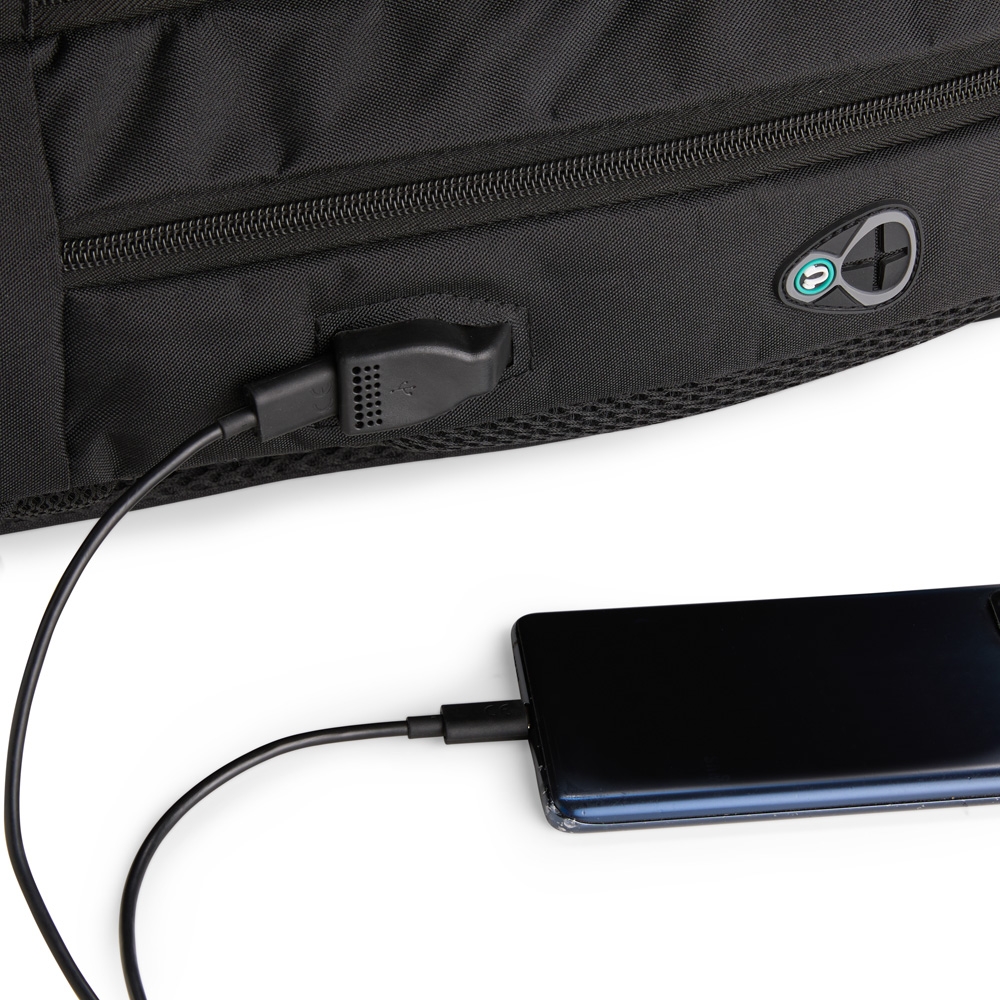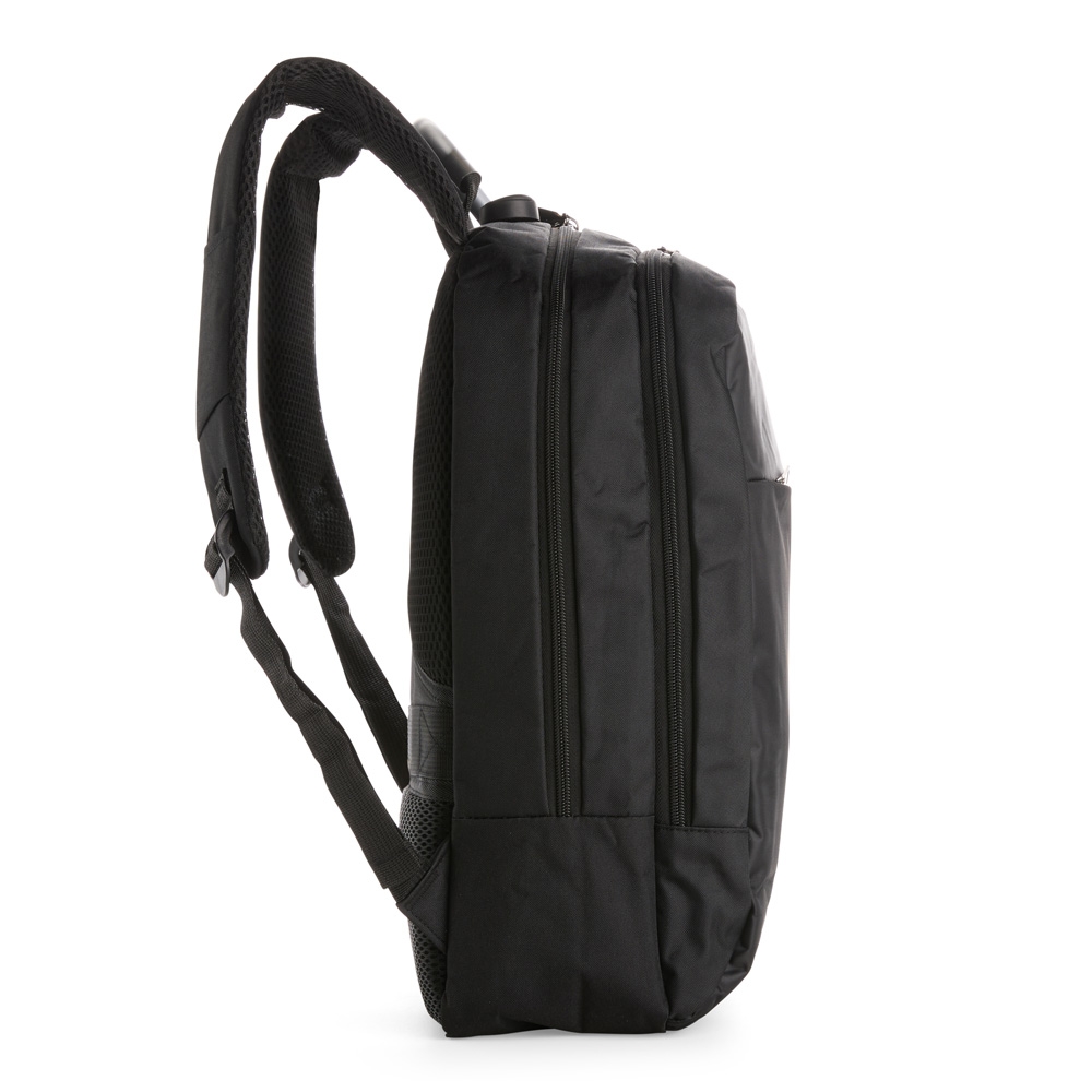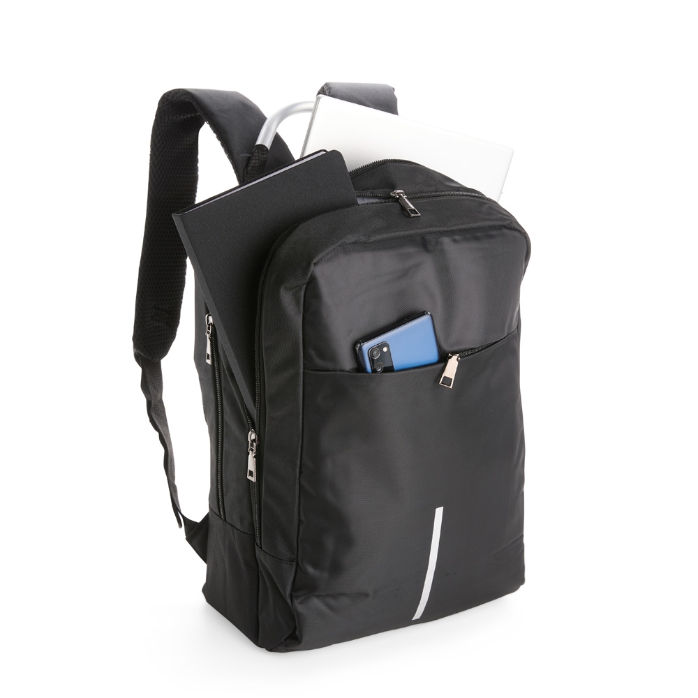 Descrição: Mochila antifurto em poliéster impermeável, com capacidade de 16 litros e fechamento em zíper. Possui cadeado de segredo, entrada externa para cabo USB, passagem para fones de ouvido, três compartimentos de diferentes tamanhos, incluindo bolso frontal com divisória para notebook de até 15,6 polegadas e alça superior reforçada. Conta ainda com engate para malas, alças de costas e painel traseiro acolchoados.
