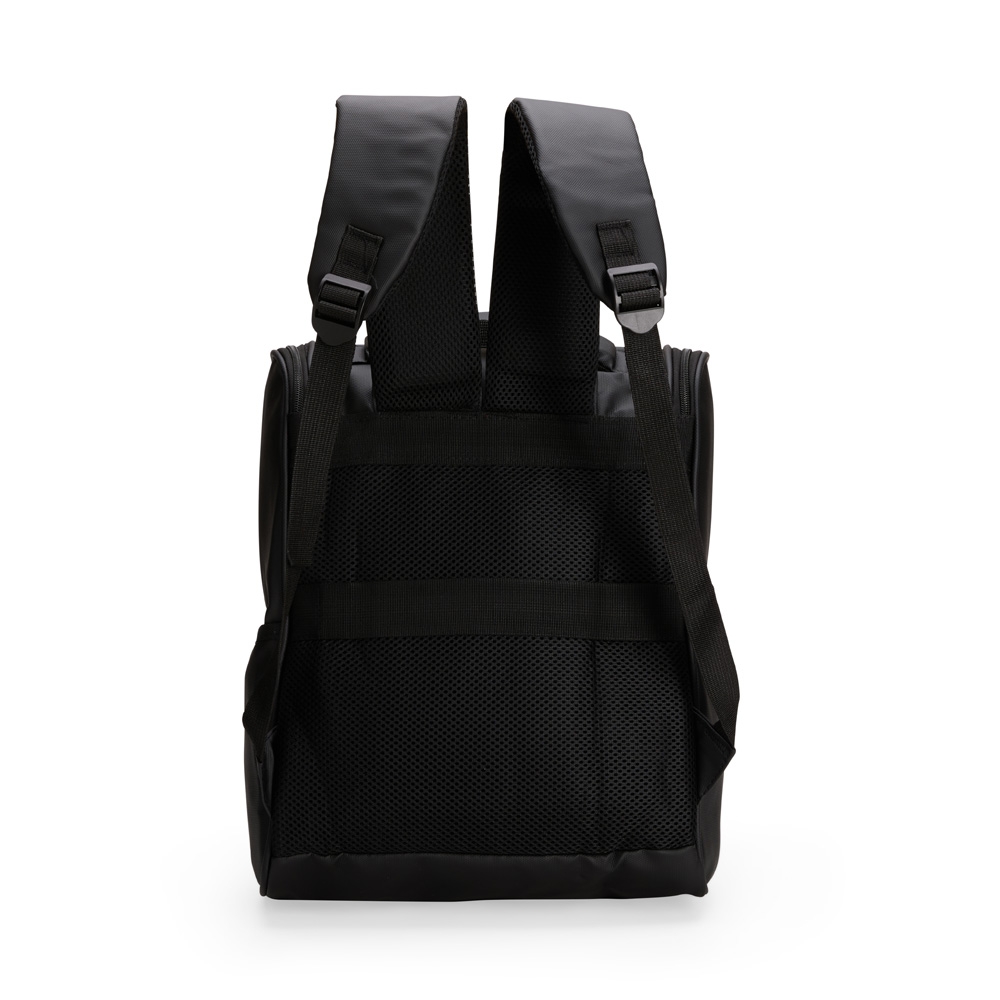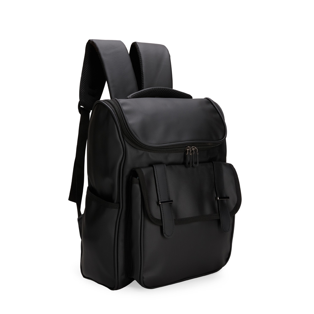 Descrição: Mochila confeccionada em couro sintético impermeável com capacidade de até 18 litros. Possui compartimento interno para notebook de até 13 polegadas. Apresenta compartimento frontal com par de fivelas e fechamento em botões magnéticos, além de dois bolsos laterais. Possui área das costas e alças de mão e de costas com revestimento em tecido respirável.