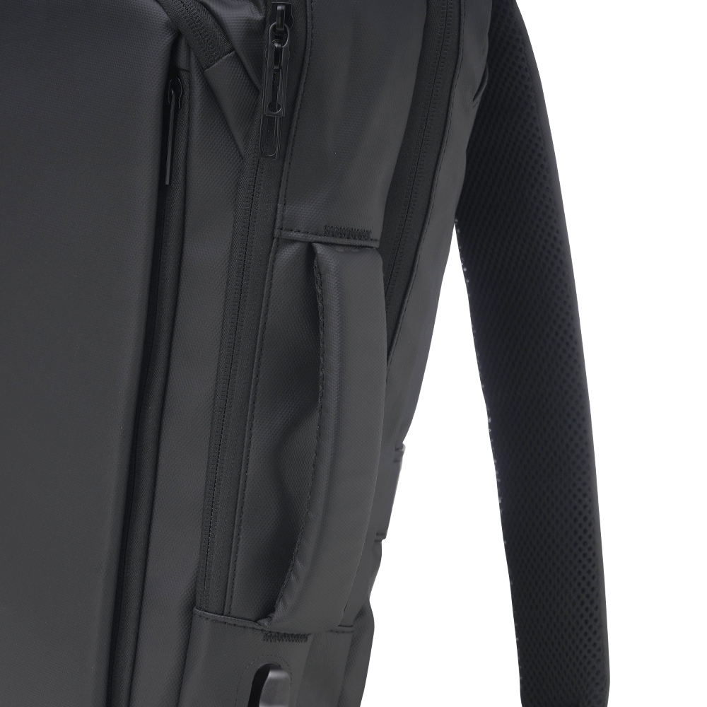 Descrição: Mochila em couro sintético 17 litros resistente à água com cinco compartimentos, sendo o principal com bolso para notebook 15,6. Com divisórias internas para acessórios, a mochila possui suporte externo usb, alça para encaixe em malas de viagem e duas alças de mãos, sendo uma delas lateral para o transporte da mochila no modo pasta.