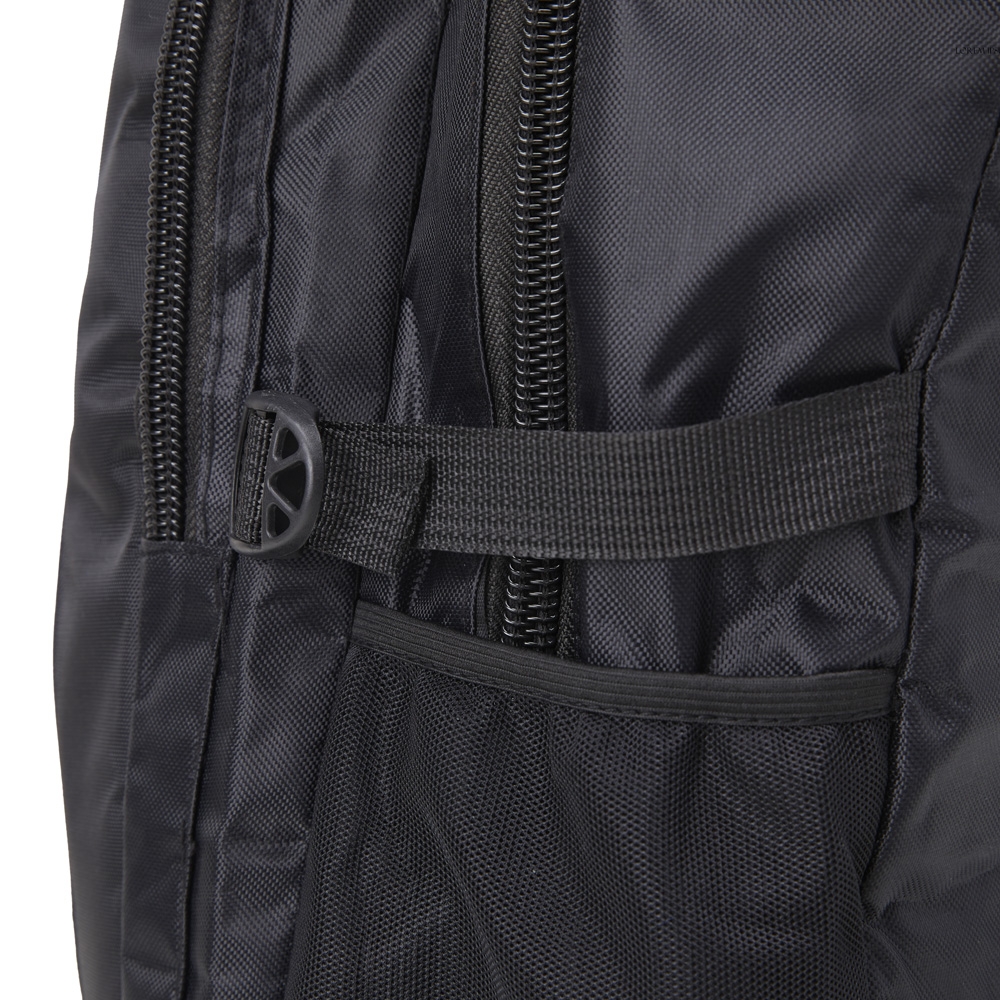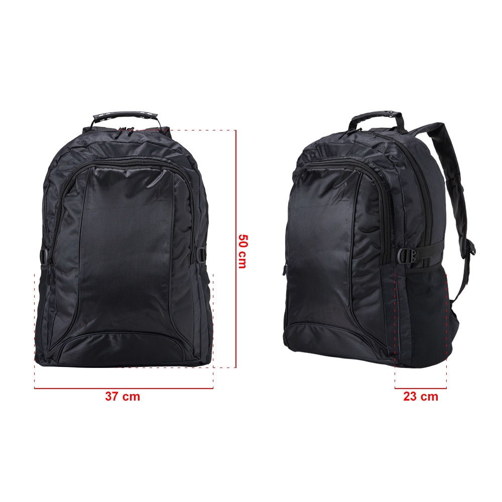 Descrição: Mochila de nylon 35 litros com dois compartimentos e bolsos laterais em malha. Possui fivelas laterais para regulagem de tamanho e duas alças de mãos, sendo uma delas reforçada com pegador plástico.