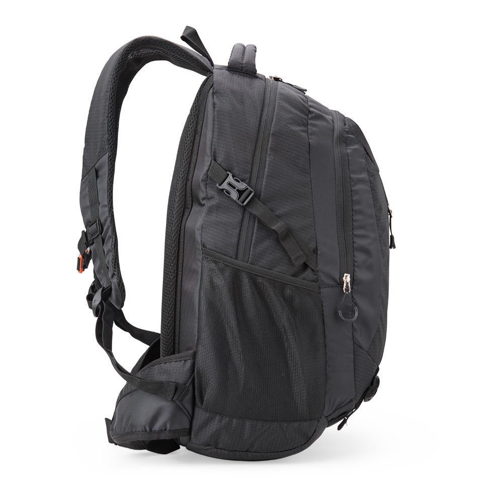 Descrição: Leve tudo e mais um pouco com a nossa mochila de poliéster de 40 litros. Espaçosa e eficiente, possui três compartimentos, sendo o principal com um bolso para notebook de até 15,6 polegadas. Conta com divisórias internas para manter acessórios organizados e bolsos laterais de tela para acesso fácil aos itens essenciais. Esse modelo possui revestimento espumado nas costas para maior conforto e, para sua segurança, tem um detalhe refletivo na parte frontal, aumentando sua visibilidade em condições de pouca luz. Além disso, há um apito integrado em uma das fivelas, e as alças de compressão e compensação ajudam a distribuir o peso de forma equilibrada.