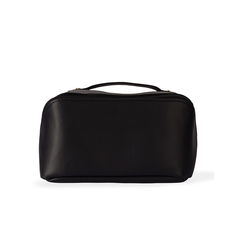 Descrição: Nécessaire confeccionado em poliuretano (PU) impermeável com abertura em 180 graus que remete ao formato de uma concha. Possui amplo compartimento interno com dois bolsos laterais abertos e um central com fechamento em zíper. Contém uma alça para transporte.