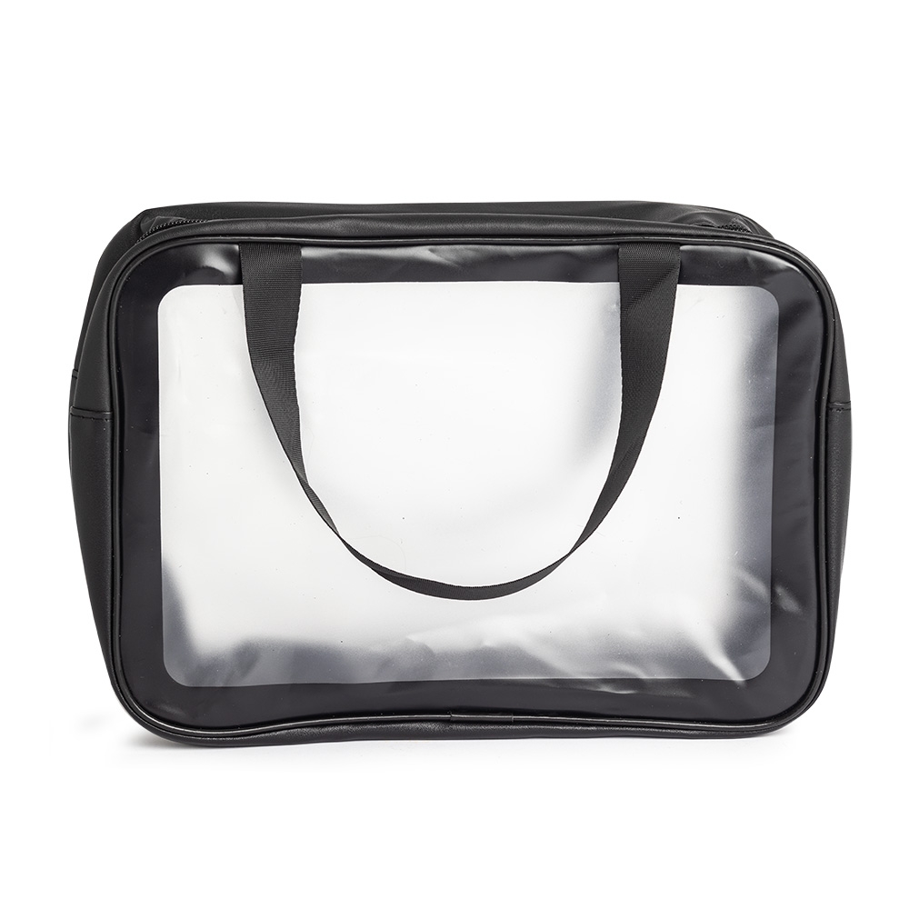 Descrição: Nécessaire de PVC e PU resistente à água, com duas alças laterais de mão.