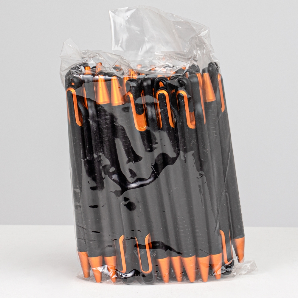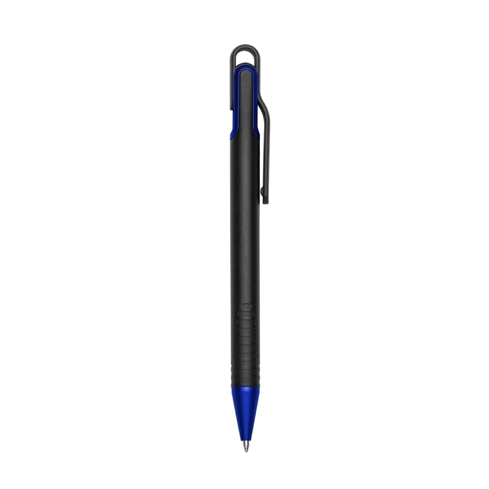 Descrição: Pacote com 50 peças da caneta plástica com carga esferográfica azul 1.0 mm e acionamento por clique.