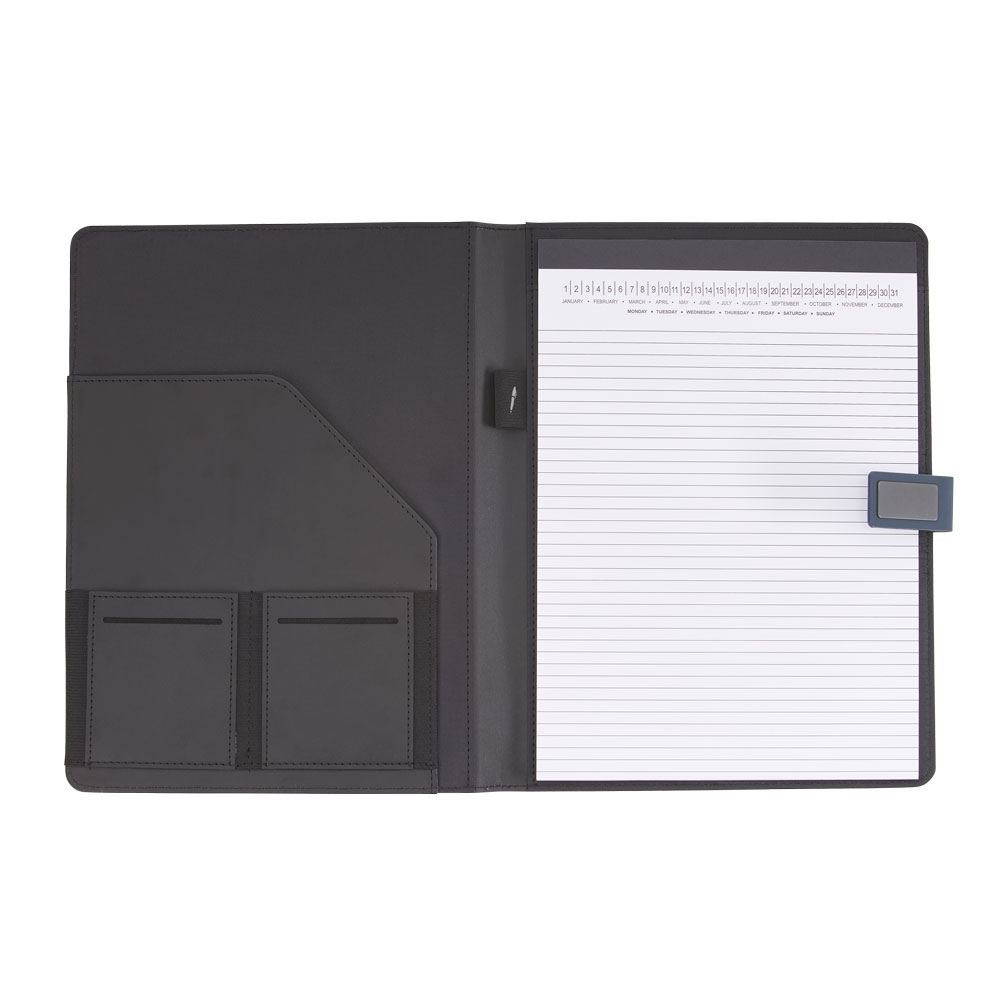 Descrição: Pasta convenção com bloco para anotações. Pasta confeccionada em material sintético, possui fecho imantado com plaquinha emborrachada, “bolso” interno para arquivar documentos, suporte para cartões, celulares e caneta, além de um bloco com folhas brancas pautadas de aproximadamente 22 folhas.