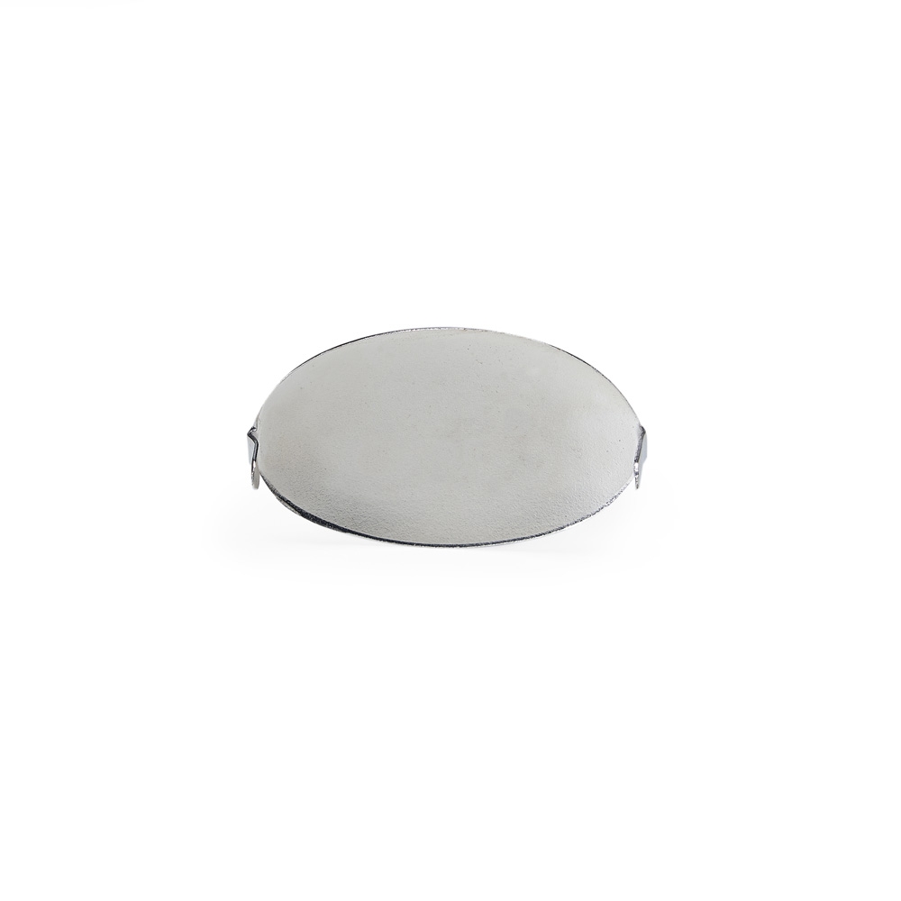 Descrição: Plaquinha metálica oval para personalização. Possui hastes com ponta na parte traseira.