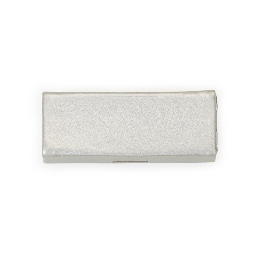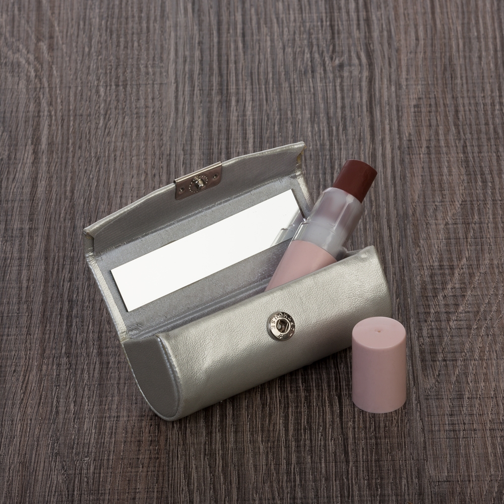 Descrição: Porta batom em couro sintético prata com plaquinha de metal frontal com botão para abrir/fechar, possui um espelho interno.