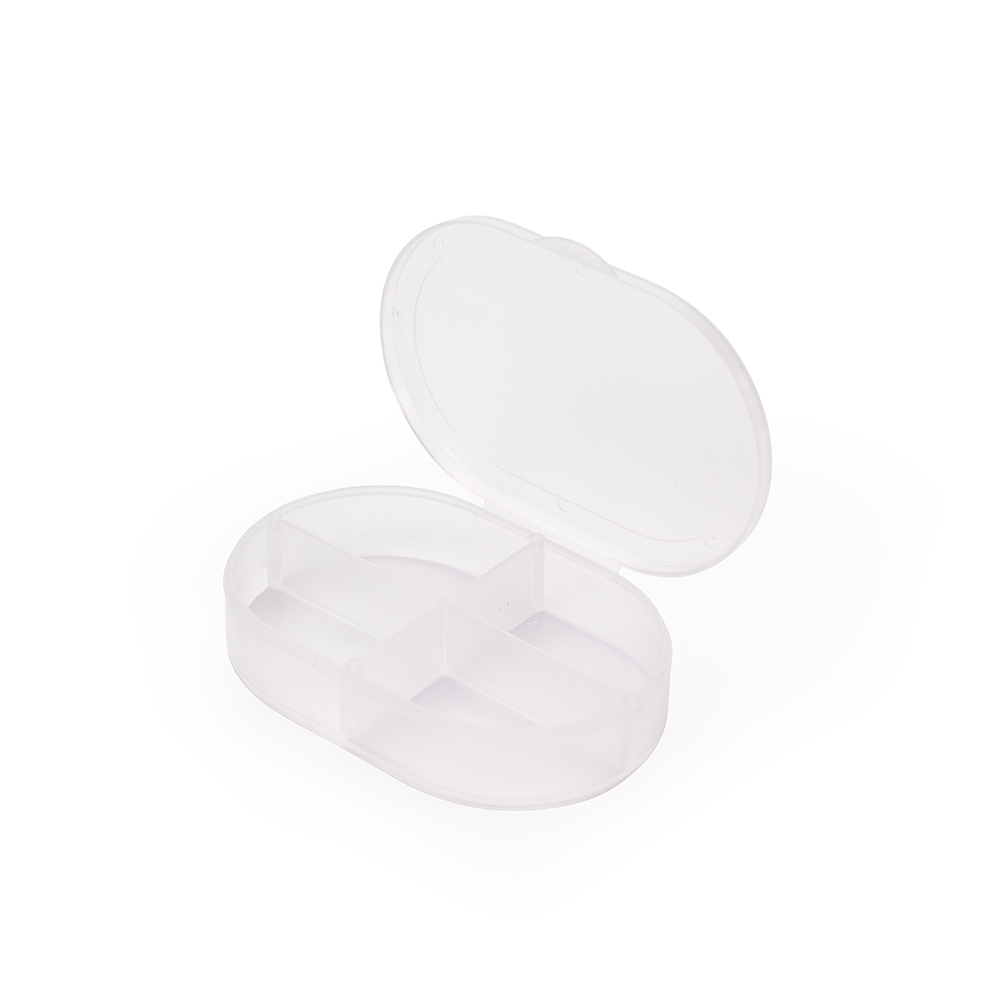 Descrição: Porta-comprimidos em plástico com quatro divisórias, oferecendo mais opções para organizar medicamentos ou pequenos objetos.