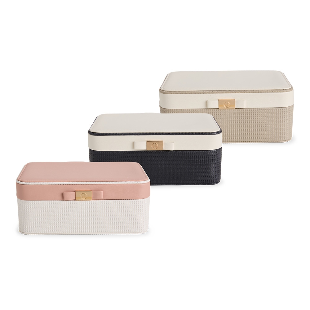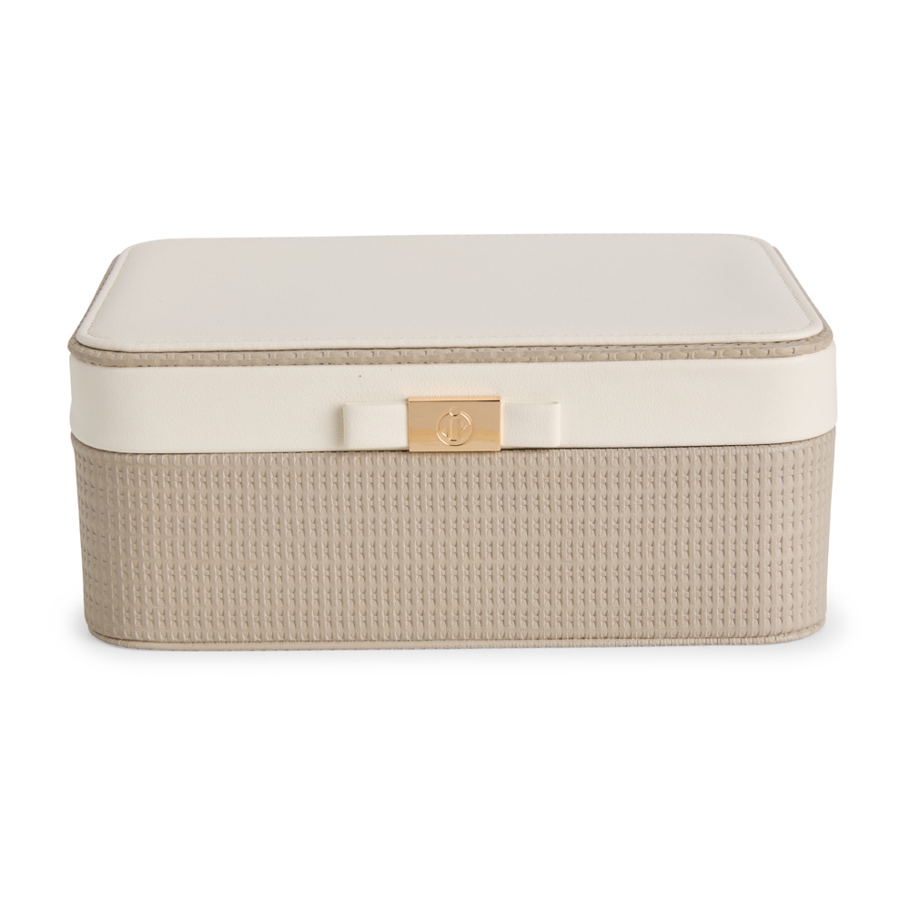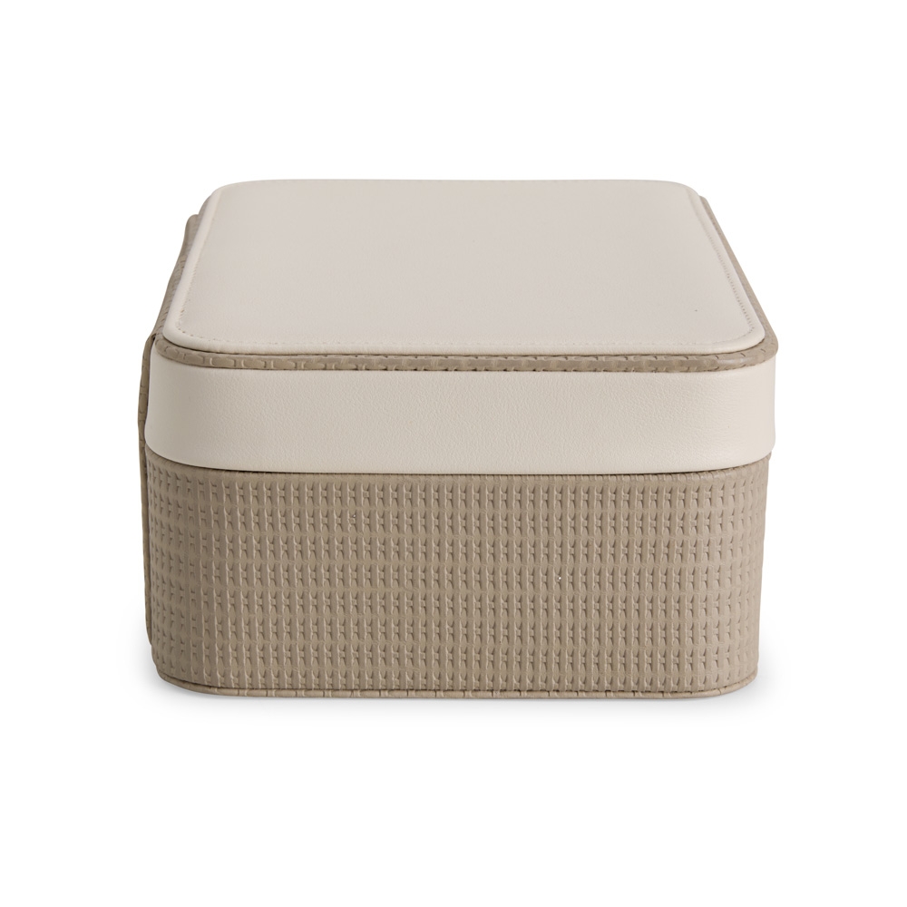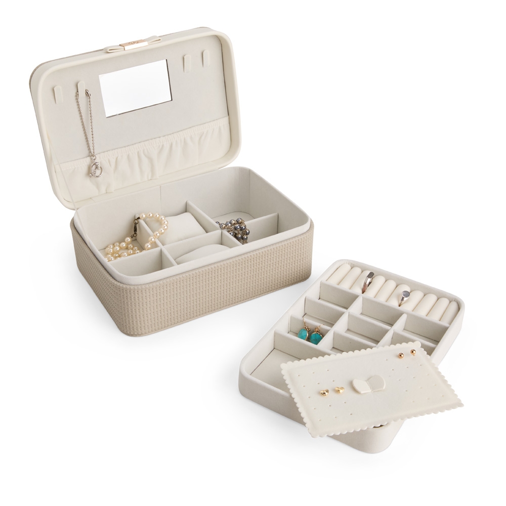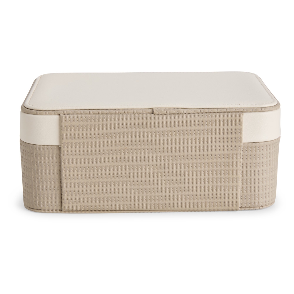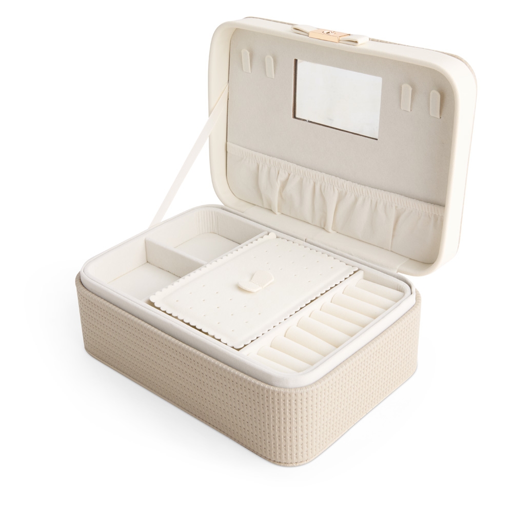 Descrição: Porta-joias em couro sintético texturizado, com detalhe frontal em metal e revestimento interno em veludo. No interior da tampa, apresenta quatro ganchos, um bolso com elástico e um espelho de formato retangular. Possui dois compartimentos principais: o superior, removível, com 12 divisórias em diferentes tamanhos, que também inclui uma tampa protetora para as divisórias centrais; e o inferior, com divisórias removíveis e duas almofadas.