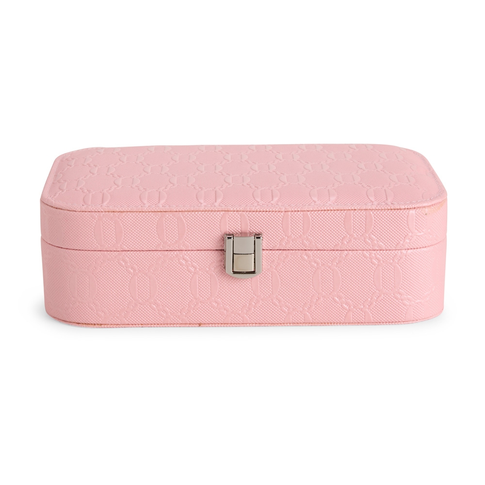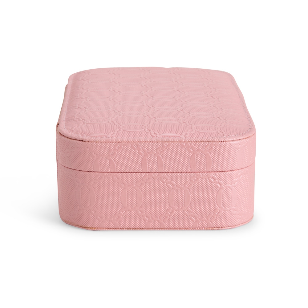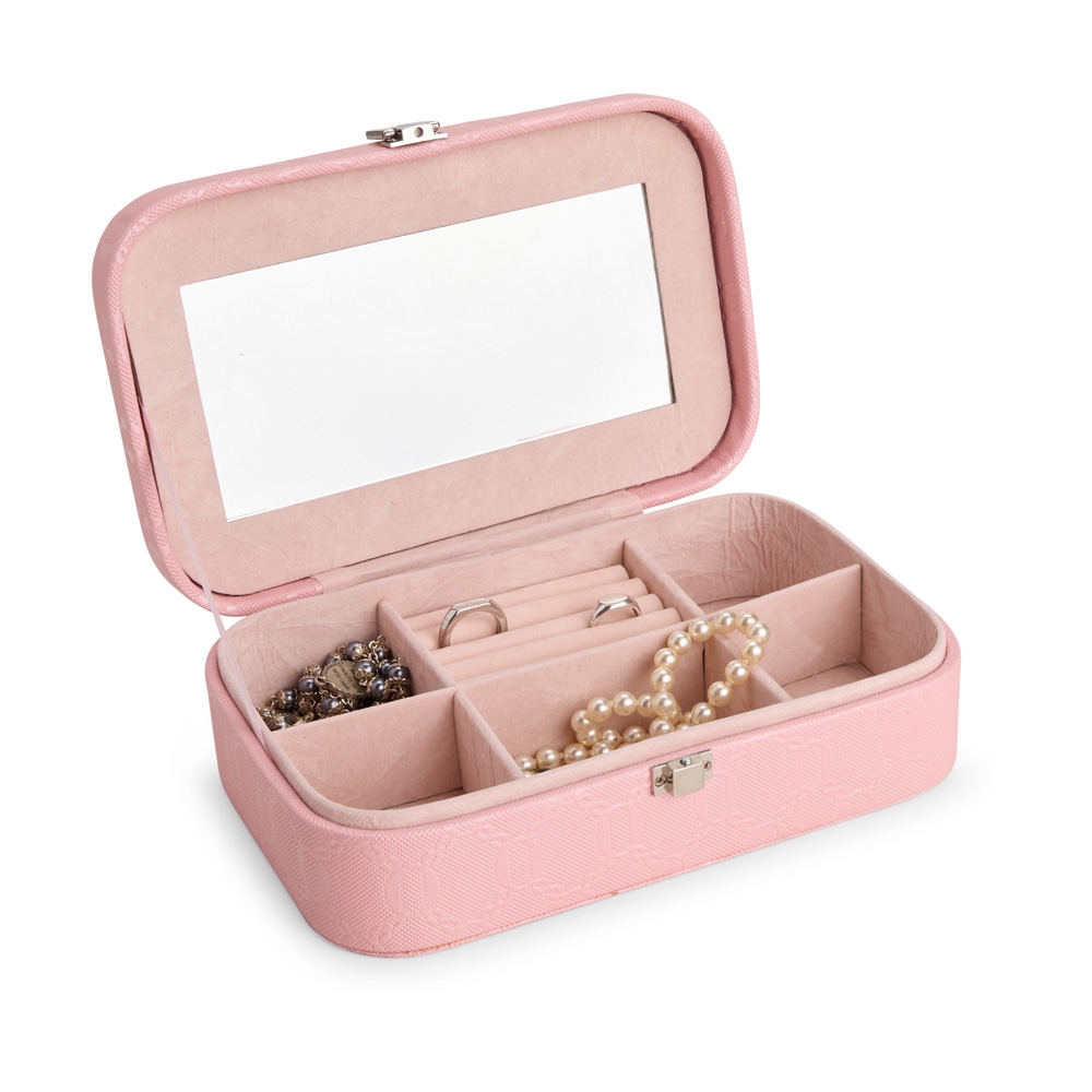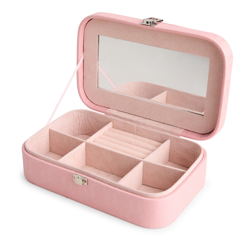 Descrição: Porta-joias em couro sintético com detalhes texturizados e trava de segurança para fechamento. Possui revestimento interno aveludado, um espelho retangular fixo e seis compartimentos em tamanhos diferentes, incluindo divisória com almofadas para guardar anéis e brincos.