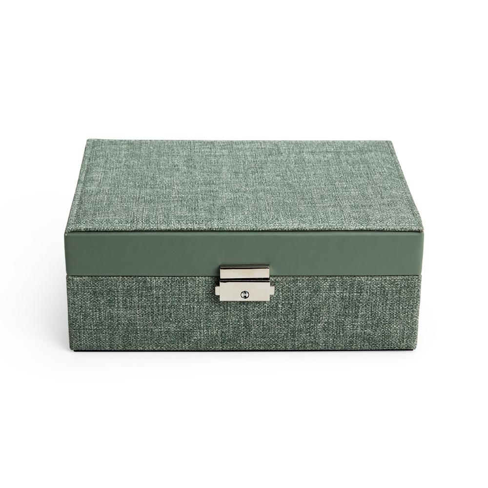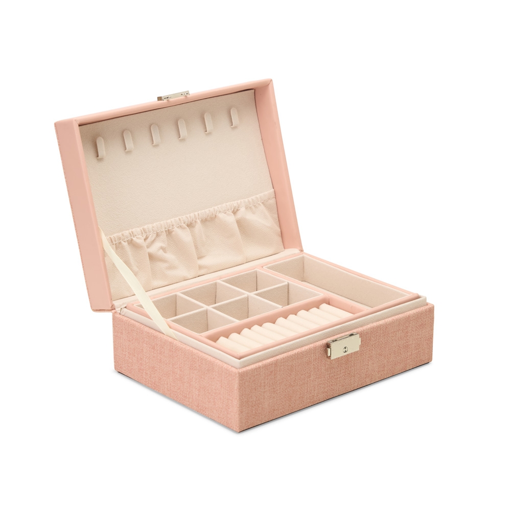 Descrição: Porta-joias em Poliuretano e revestimento interno em tecido aveludado. Apresenta dois compartimentos principais com divisórias em diferentes tamanhos, incluindo uma repartição almofadada com ranhuras. Conta ainda com seis ganchos e um bolso com elástico na parte interna da tampa. O estojo possui trava de segurança e chave para fechamento.