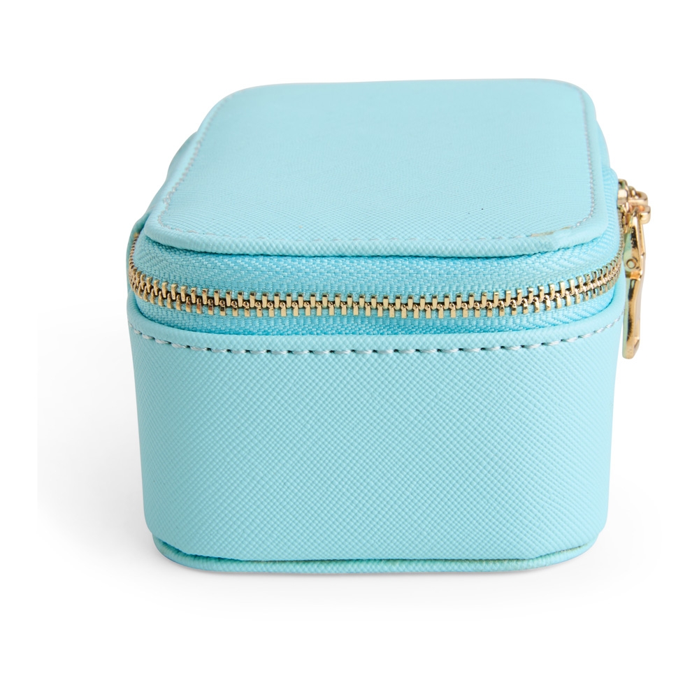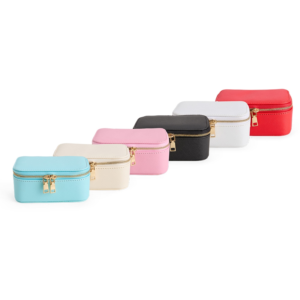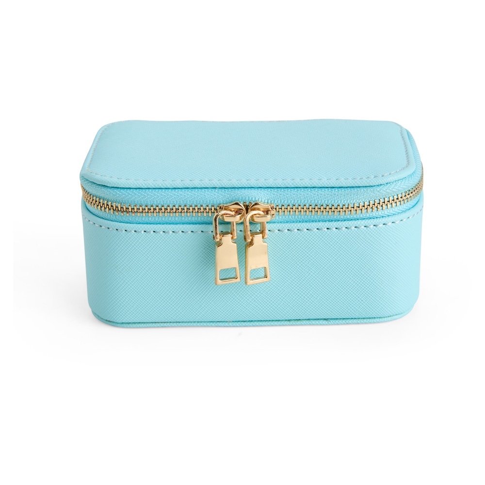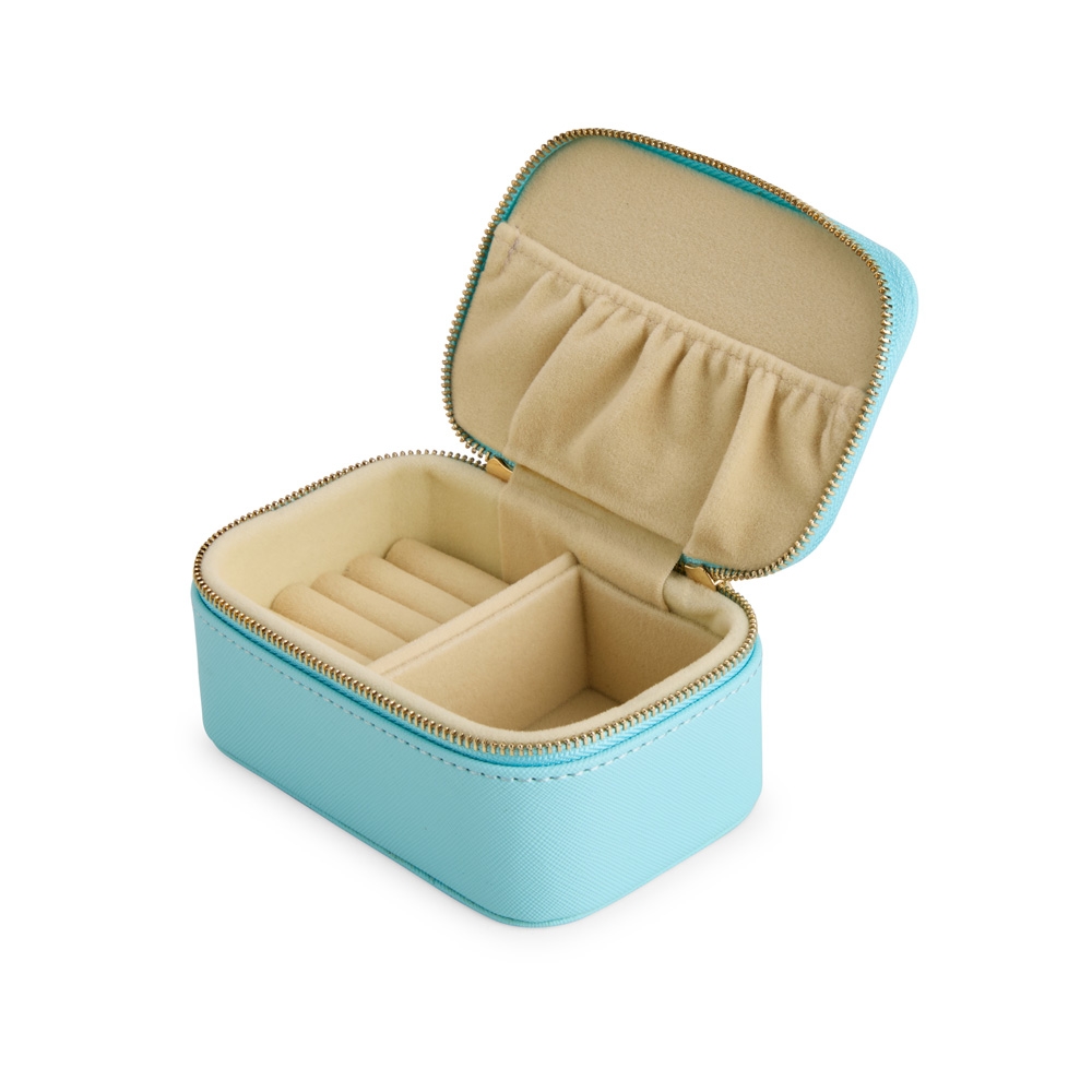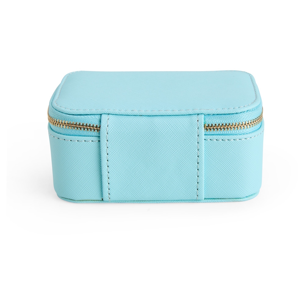 Descrição: Porta-joias em couro sintético levemente texturizado, fechamento em zíper com dois puxadores e revestimento interno em veludo. Possui bolso com elástico na parte interna da tampa e duas divisórias principais, uma delas com almofadas para anéis e brincos.
