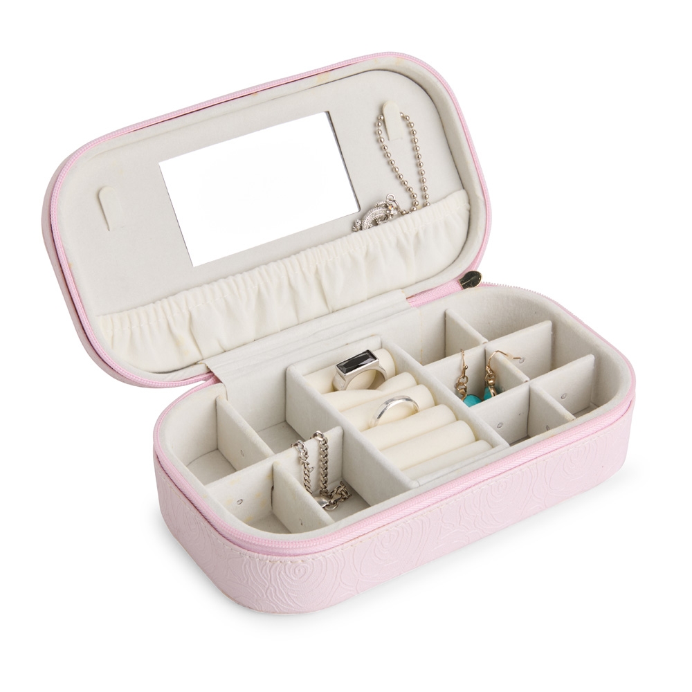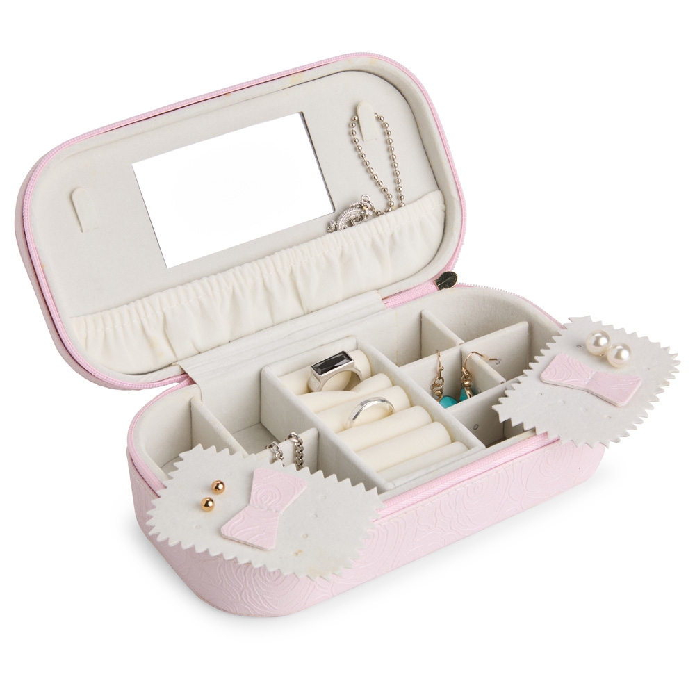 Descrição: Porta-joias em couro sintético e fechamento em zíper com puxador que remete ao formato da torre Eiffel. Possui revestimento interno aveludado, espelho retangular fixo, dois ganchos e bolso posicionados na parte interna da tampa, além de divisórias removíveis no compartimento principal e outra com almofadas para anéis e brincos.