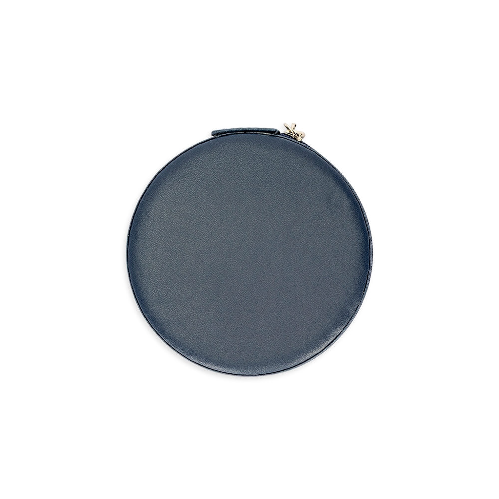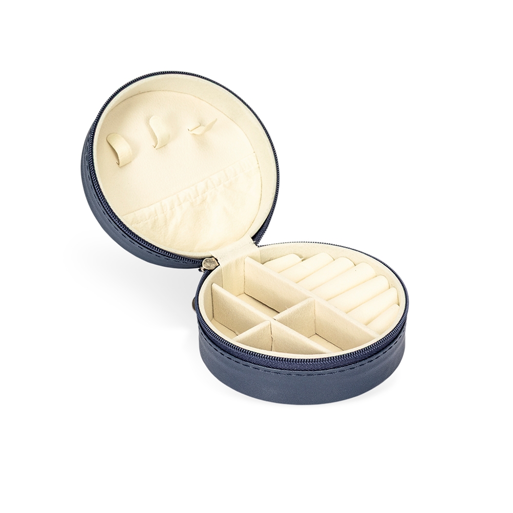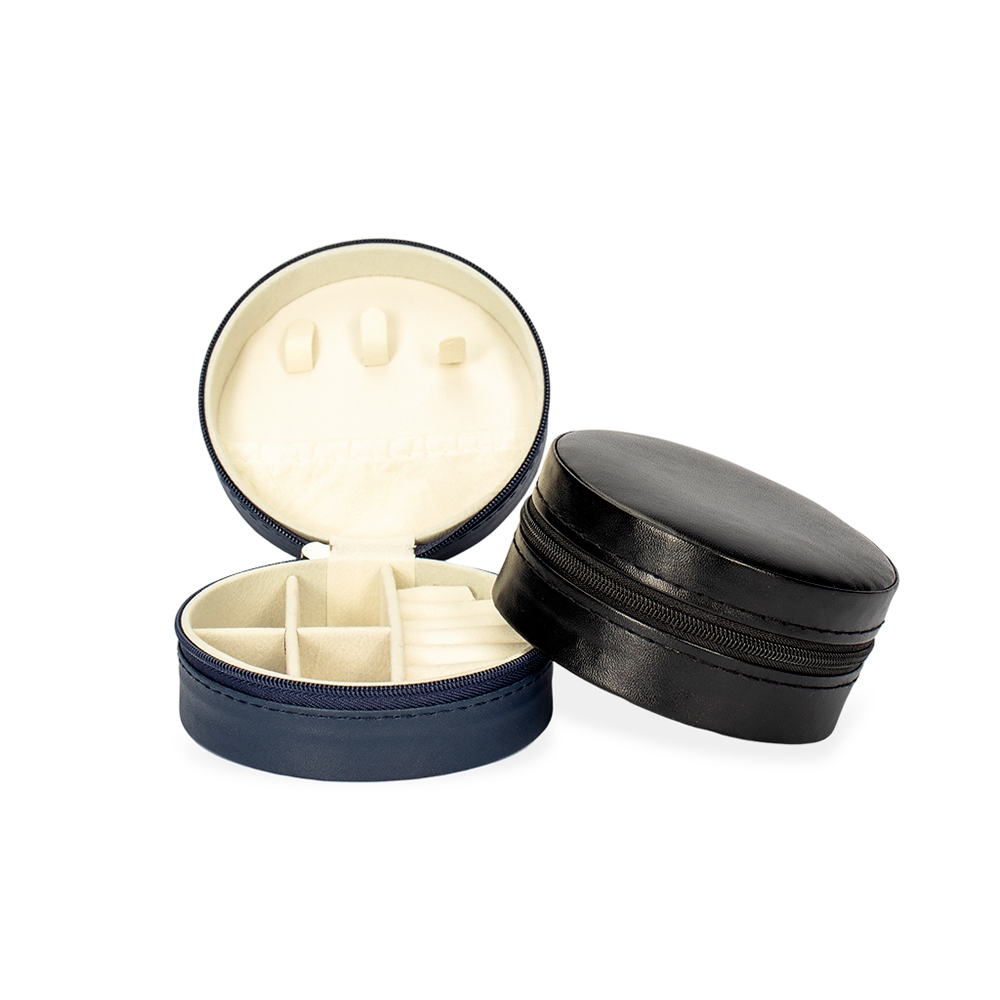 Descrição: Porta-joias de formato redondo em couro sintético e fechamento em zíper. Possui revestimento interno aveludado, além de três pequenos ganchos, um bolso com elástico, divisórias removíveis e almofadas fixas para abrigar anéis.