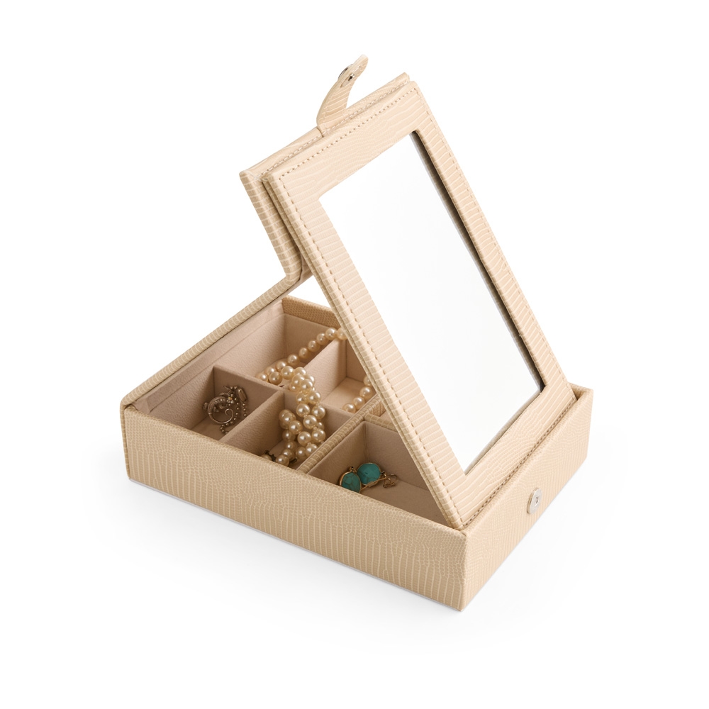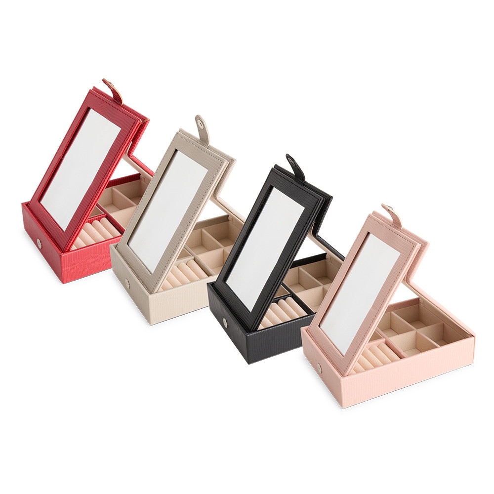 Descrição: Porta-joias em couro sintético texturizado com fechamento por botão magnético. Possui um espelho retangular fixo à uma aba na tampa articulada do estojo, oferecendo opções de ajuste de inclinação. Dispõe também de revestimento interno aveludado e seis divisórias em tamanhos variados, sendo um deles com almofadas para anéis e brincos.