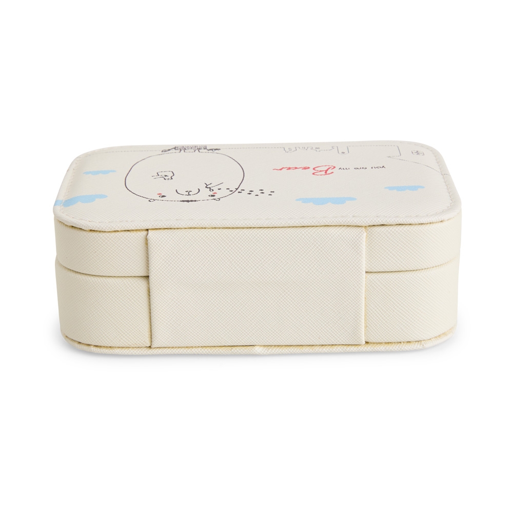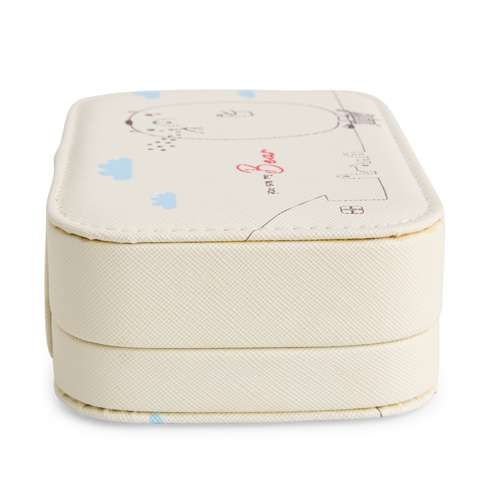 Descrição: Porta-joias em couro sintético com trava de segurança para fechamento. Possui revestimento interno em veludo, espelho retangular no interior da tampa e três divisórias no compartimento principal, uma delas com almofadas para abrigar anéis e brincos.