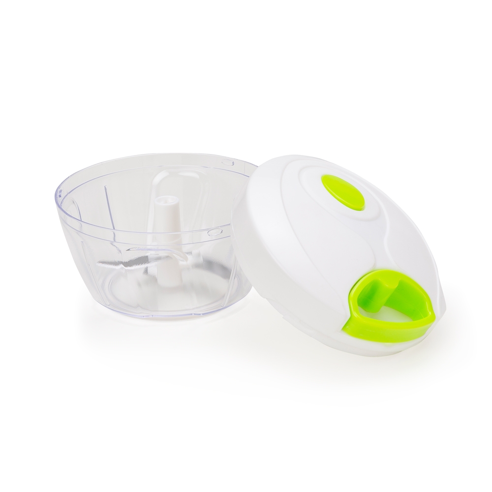 Descrição: Processador de alimentos manual, tampa plástica de polipropileno com puxador verde, pote transparente em poliestireno com relevo e lâminas em aço inox.