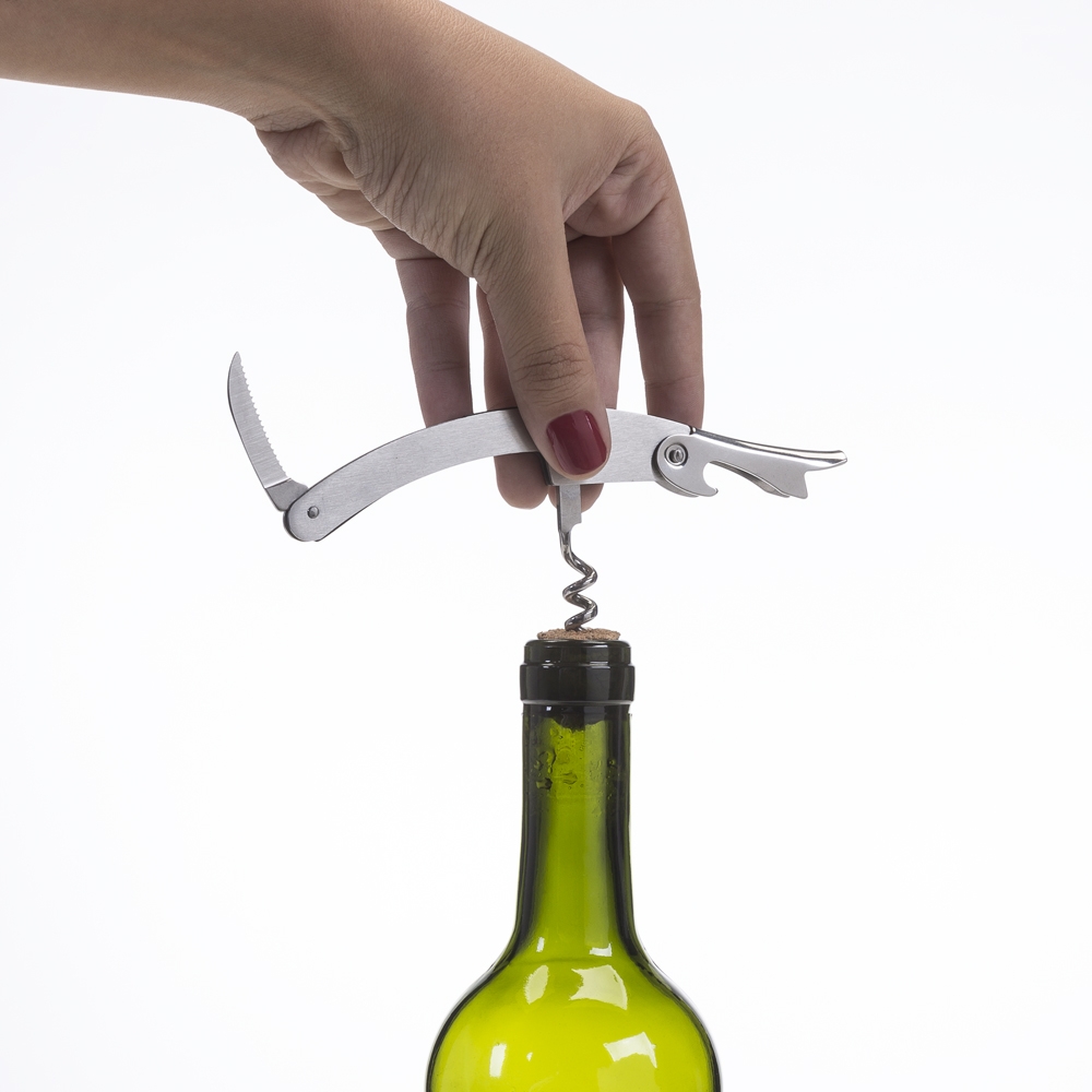 Descrição: Saca-rolhas metálico com lâmina de corte e abridor de garrafa.