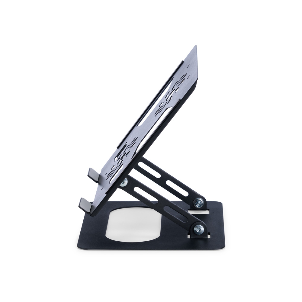 Descrição: Suporte para notebook em aço com ajuste em múltiplos ângulos e capacidade para aparelhos de até 15,6 polegadas. Conta com aberturas que favorecem a dissipação de calor e tiras antiderrapantes para maior estabilidade.