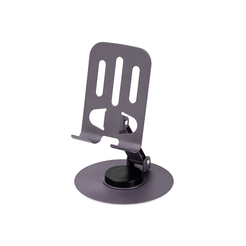 Descrição: Suporte de celular retrátil em metal ajustável em diferentes ângulos e rotação de 360 graus.