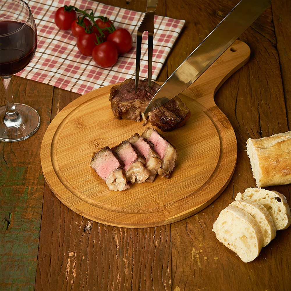 Descrição: Tábua de bambu média com canaleta e cabo.