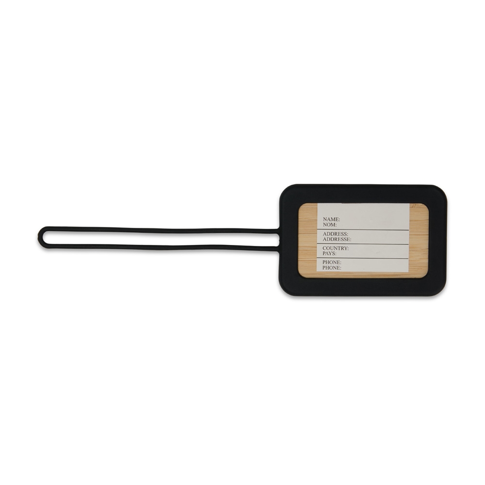 Descrição: Tag identificador de bagagem de Bambu e silicone. Parte frontal com área de identificação e verso liso para personalizações.